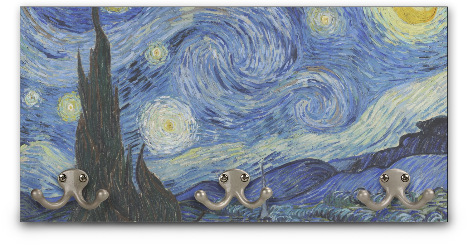 Now you can enjoy Starry Night on a daily basis! Well not all of it! To put this rectangular painting (roughly 4x3) on products, we use as much of the painting as we can on each product. So for a square product like the shower curtain - we use a 3x3 rectangle - which cuts off a little of the sides - but is still very much The Starry Night! For other products such as the wristlet (a wide 4x1 rectangle) - you get a small slice of the painting.