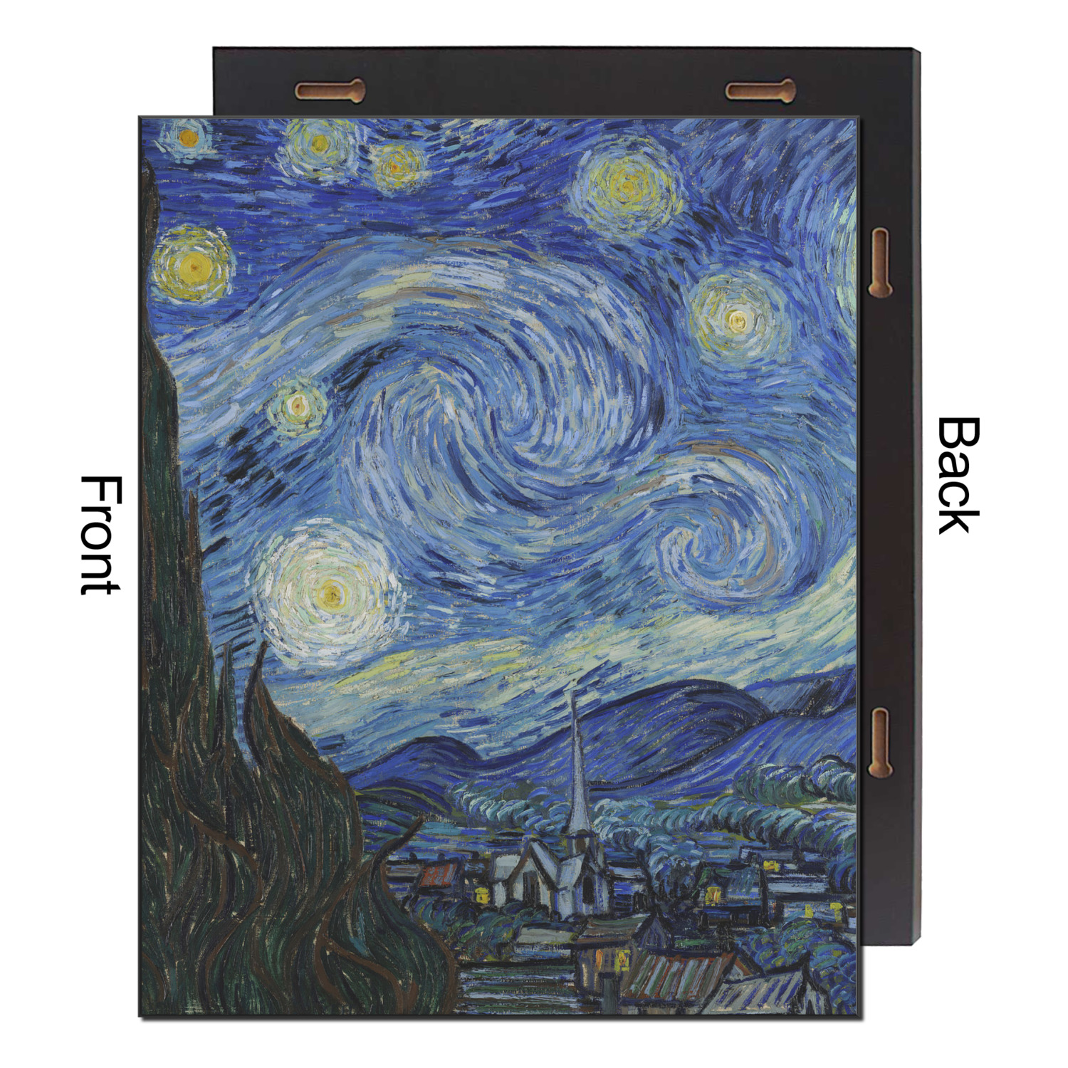 The back of the wood print has 2 keyhole slots on the two sides for hanging both in landscape, as well as portrait mode.