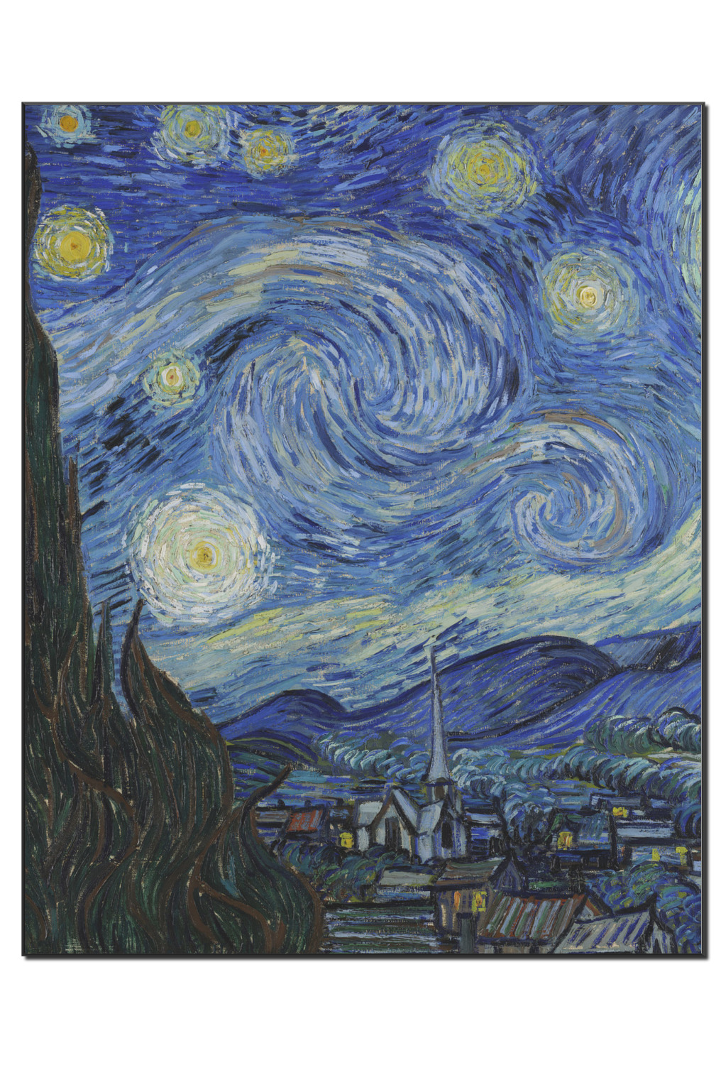 The Starry Night is an oil on canvas by the Dutch post-impressionist painter Vincent van Gogh. Painted in June 1889, it depicts the view from the east-facing window of his asylum room at Saint-Remy-de-Provence, just before sunrise, with the addition of an idealized village. It has been in the permanent collection of the Museum of Modern Art in New York City since 1941, acquired through the Lillie P. Bliss Bequest. It is regarded as among Van Gogh's finest works, and is one of the most recognized paintings in the history of Western culture. (source wikipedia)