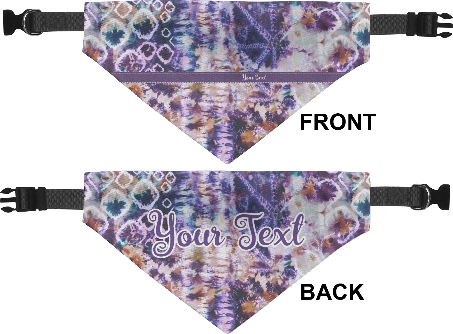 We print the front and back of these dog bandanas with your customized design. The bandana itself is made from a durable polyester, sewn together with a gap large enough to accommodate any collar. Regardless, the bandana includes a plain black, canvas collar with plastic snaps, that can easily be removed if desired. These dog bandana collars are available in four sizes: small, medium, large, and extra large. Please see our sizing chart for more information regarding the dimensions of each size.