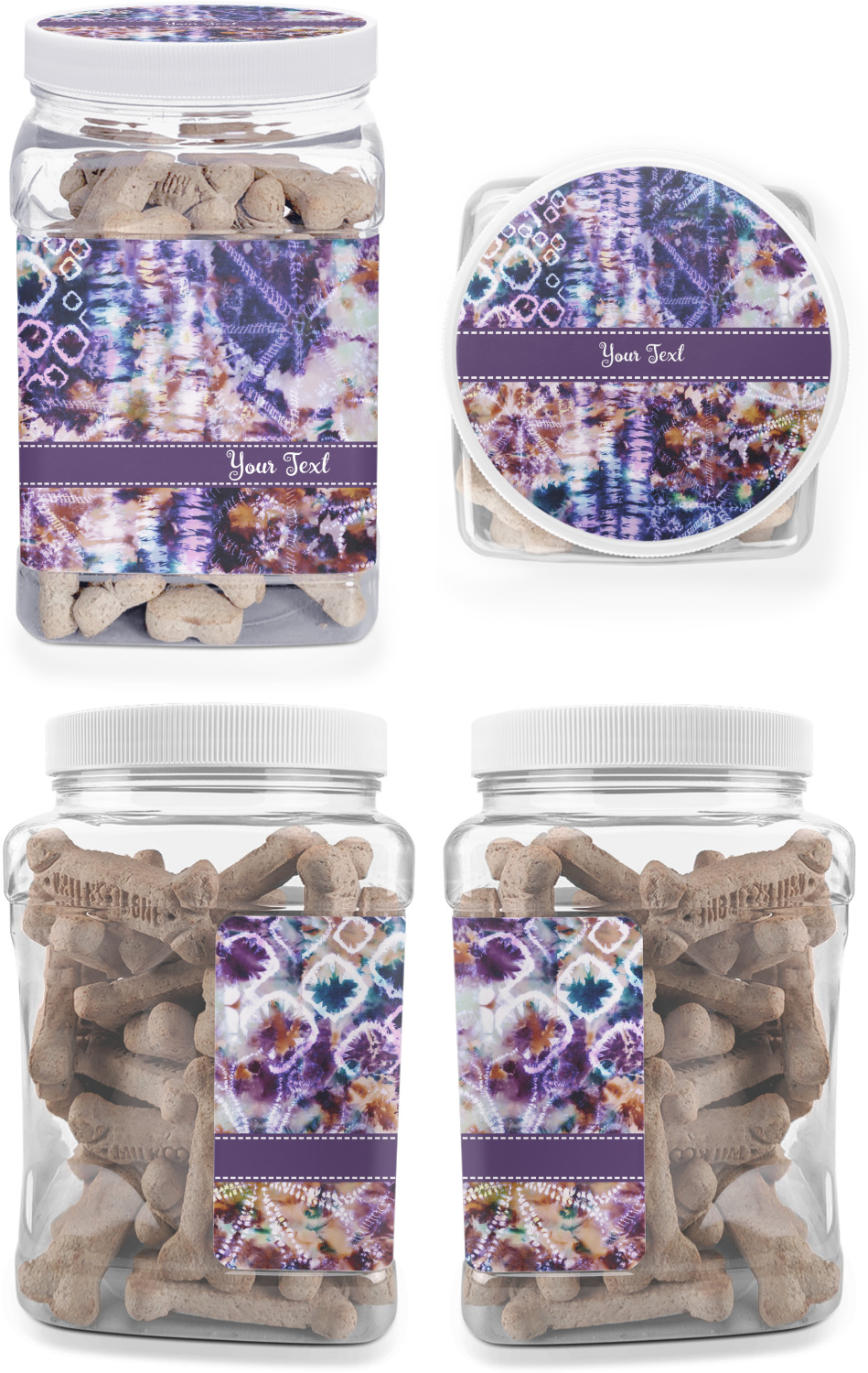 This half gallon jar, made from a sturdy plastic, is the perfect way to keep treats from any naughty pet paws, while still keeping them ready on hand for when your pup performs an impressive trick. This dog cookie jar features a screw-on, white lid that displays your personalized design on a vinyl sticker. We apply another customized sticker that wraps around the front and sides of the jar. Our dog treat jar also has indentations on the rear ends of the sides, which allows for convenient handling, and its square frame allows for easy storage.