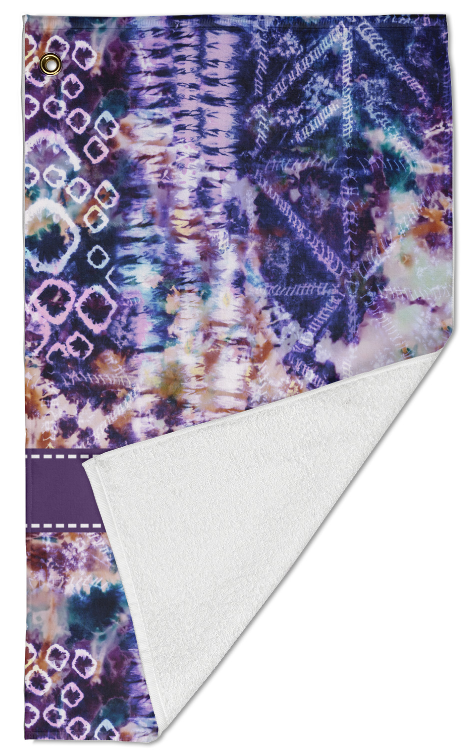 The towel is fully printed / patterned on the front polyester side; and is white on terrycloth cotton backside. The towel has grommet and a pear spring clip in the top left corner. Our golf towels are available in 100s of different prints and patterns.