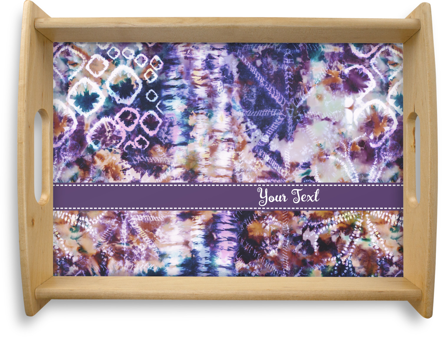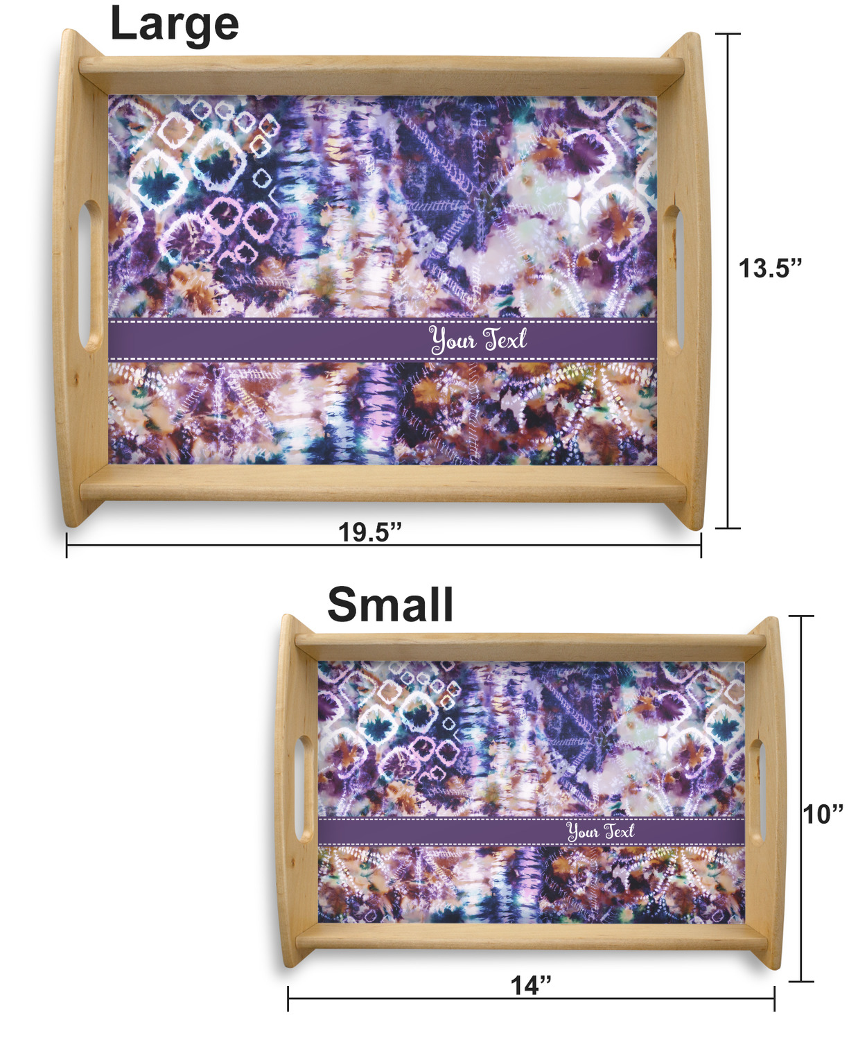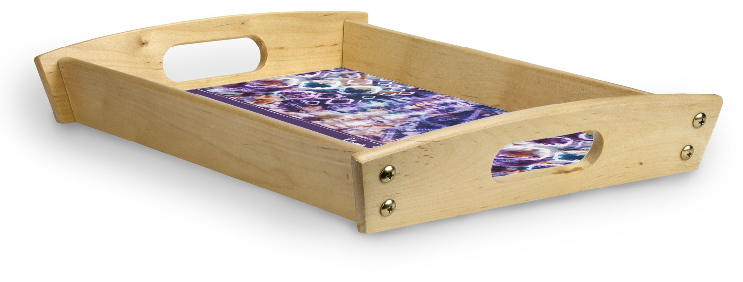 This serving tray with handles features square edges and two rounded sides, creating a very modern look. Each side is fabricated from a beautifully cut, natural wood. The bottom of the interior of the tray displays your customized design in bright, vibrant color. The tray is sold in both a black color and a natural wood look. Each variation of the wood serving tray has two sizes: Small, which is 14" x 10" x 2.25", and Large, which is 19.5" x 13.5" x 2.75".
