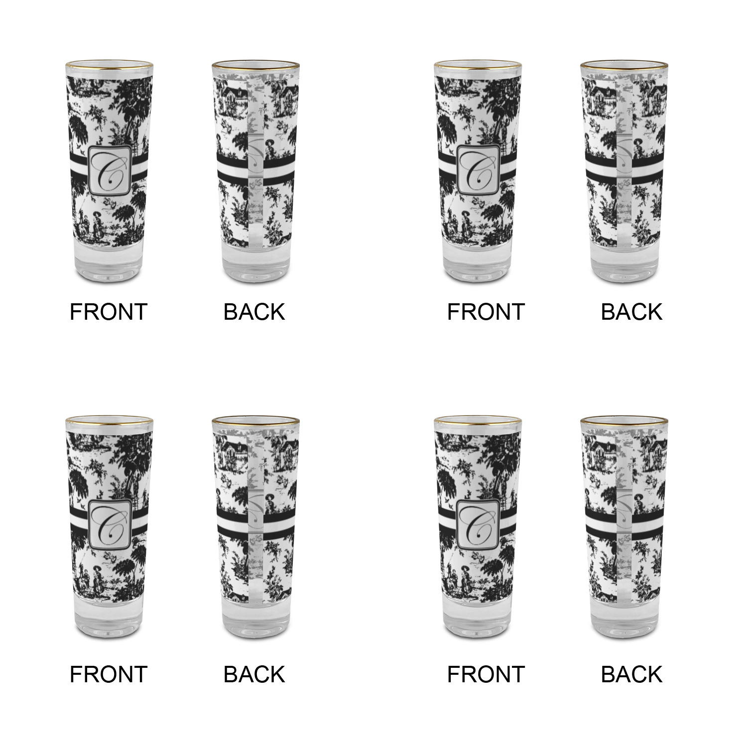 These glass shooter glasses are printed in full color with the design of your choice. These are a tall shooter 2 oz size and stand 4" tall. The print is a full wrap design to boldly display your personalization.