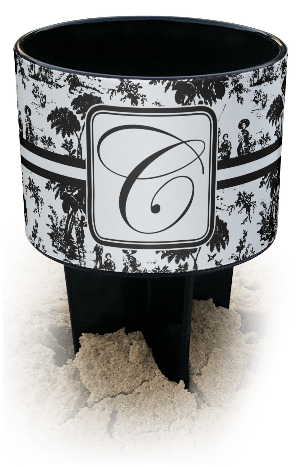 This cup holder has a large stake at its bottom that anchors it to the sand or ground below, while the cup holder rests above the stake. The entire drink holder is made of durable plastic and displays your customization around the cup holder portion. We sell these personalized beach spikers in two different colors: black and white.
