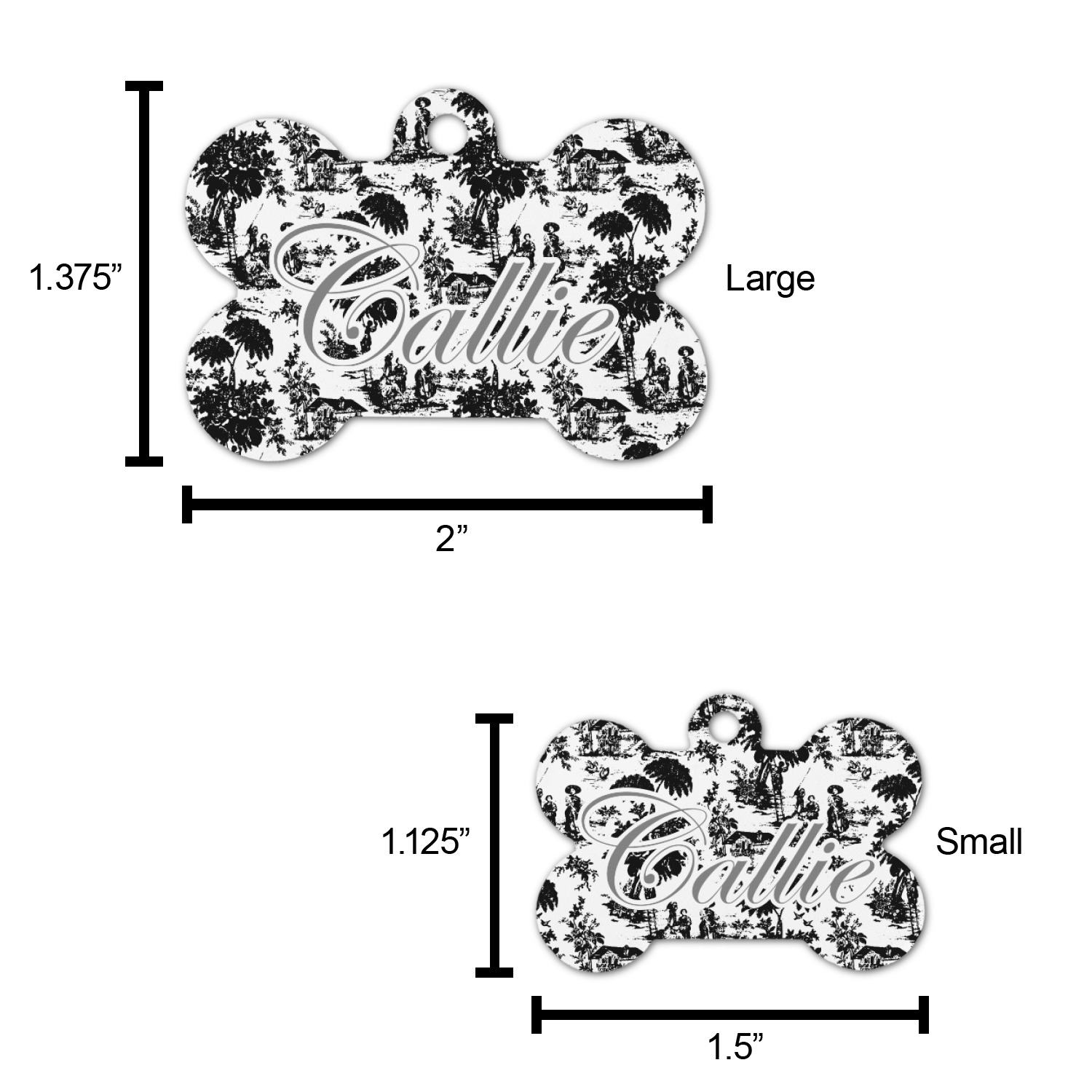 The small bone dog tag size is perfect to pair with our small dog collars, the large size pairs well with our large dog collars.