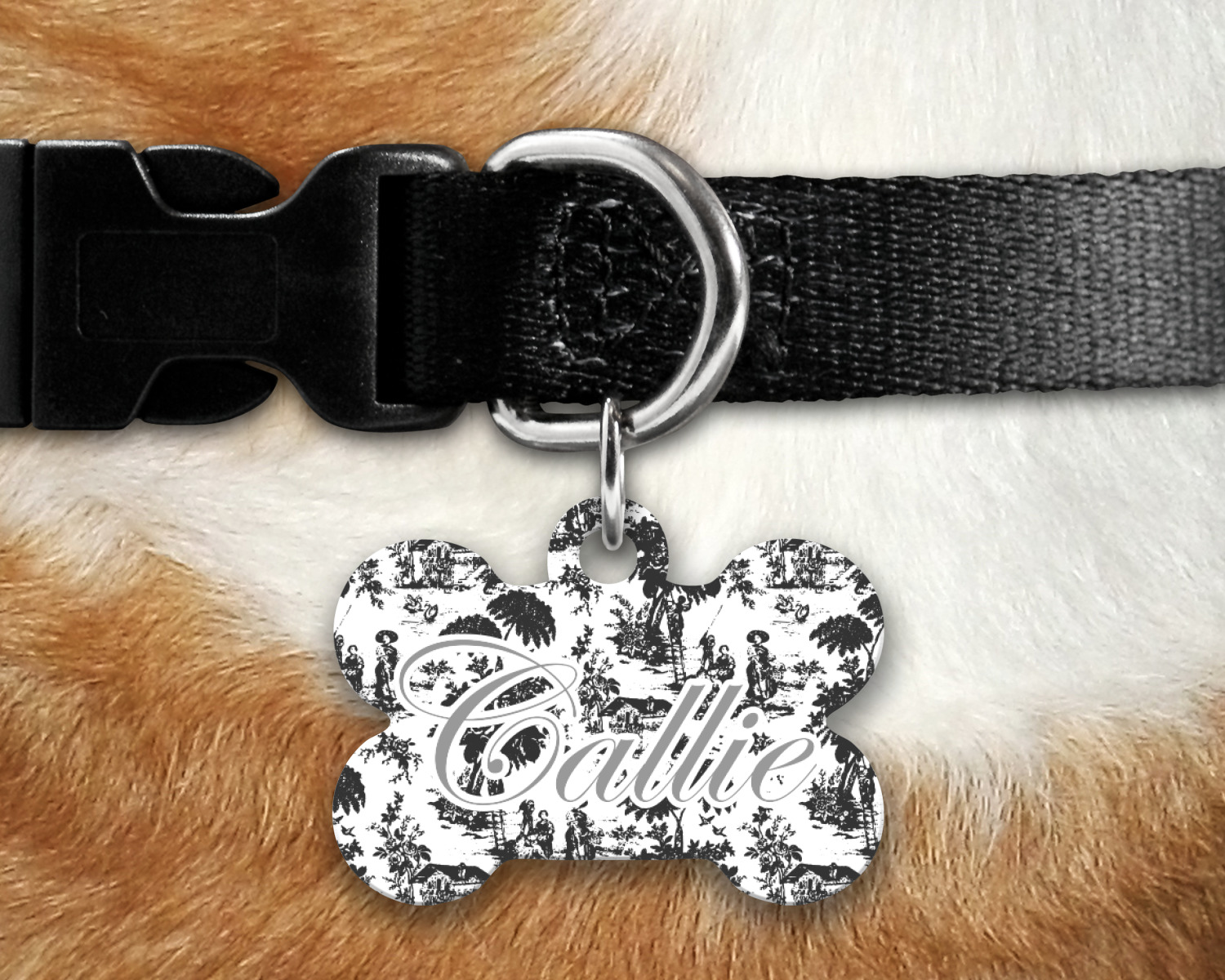 Our default design templates print your dog's personalization on the front and your contact information on the back; however everything is customizable, so you customize the patterns, the colors, the personalization, the contact information etc.