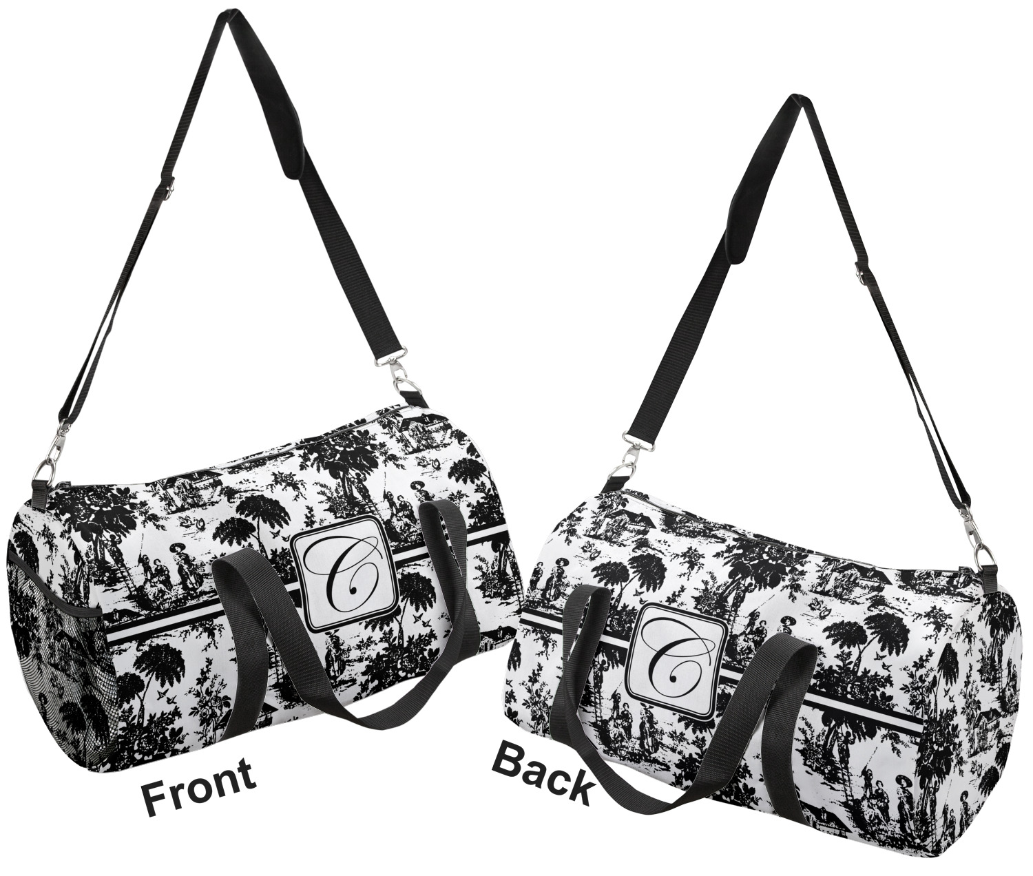 This duffle is a sturdy bag made of a canvas material. It comes in two sizes: Small (19"W x 9.5"H x 9.5"D) and Large (23"W x 12"H x 12"D). The bag is a cylindrical shape with a black adjustable strap and two handles. On one side is an elastic pouch to put a waterbottle or other small item. Your product will be sublimated with your design and is able to be designed on the front, back, and sides. Be sure to remember that the straps may cut into parts of your design if you upload your own artwork.