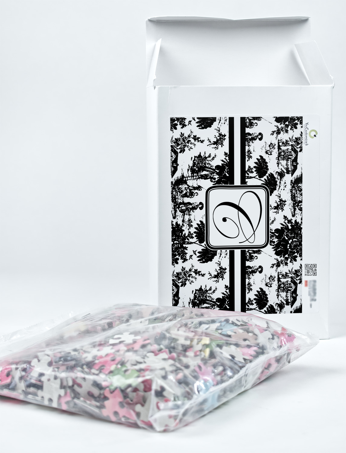 We print our puzzles on thick white chipboard in vibrant colors, then laminate the chipboard and die cut your puzzle. Your jigsaw puzzle is shipped to you in a box with the image of the puzzle on the box.