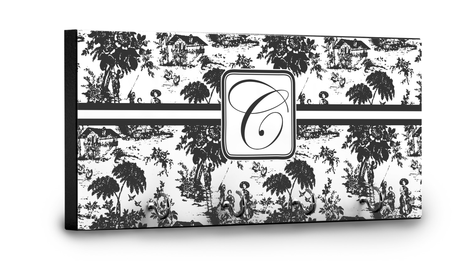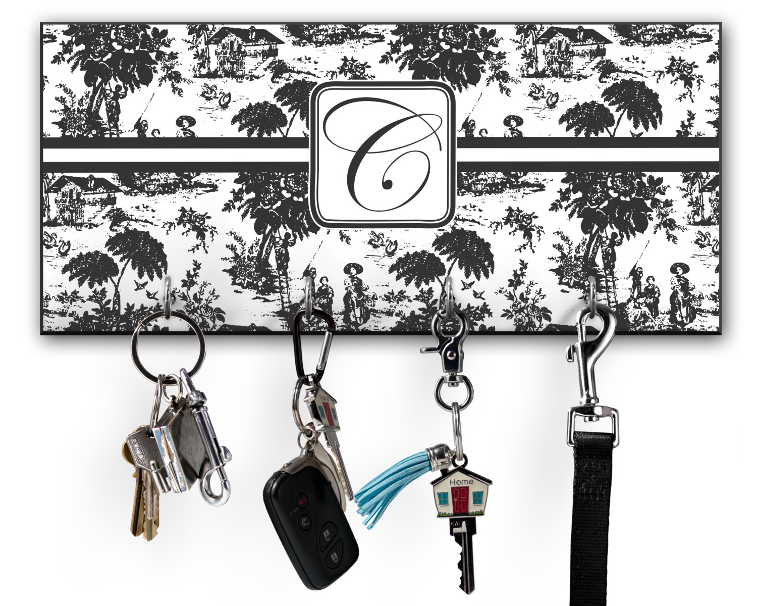 This 11" x 5" key hanger is made of sturdy wood and has four metal hooks lining the bottom. This is the perfect size for a family with several drivers. Not only can you hang keys on it though, but pet leashes and other small items. The board is black on the sides and back and is printed with the design of your choice on the front.