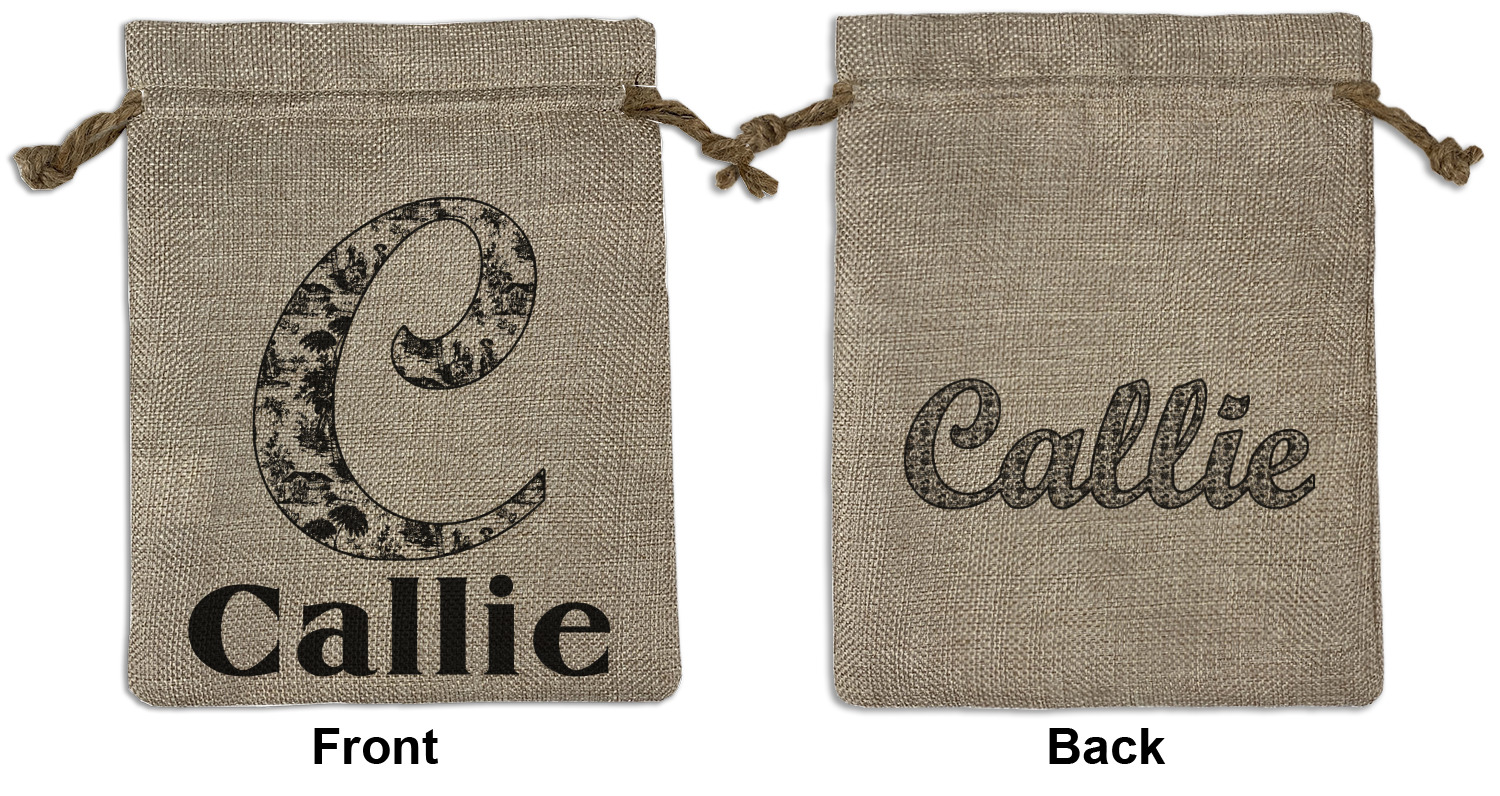 We sell our Burlap Gift Bags in 3 variant sized bags. Made with burlap polyester, each personalized bag can be secured with a twine drawstring pull. Your custom design is available to print on one side or both sides - completely up to you! The sizes of the bags measure approximately 4.5" x 6.5" for the smallest size, 6.5" x 8.0" for the medium size, and 6.5" x 13.5" for the large-sized bag.