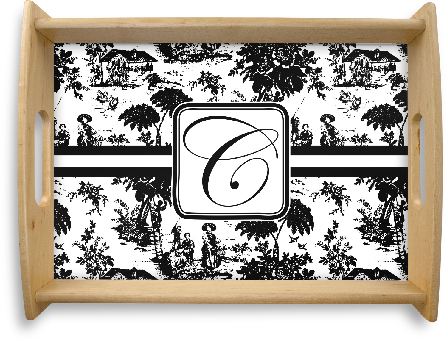 This serving tray with handles features square edges and two rounded sides, creating a very modern look. Each side is fabricated from a beautifully cut, natural wood. The bottom of the interior of the tray displays your customized design in bright, vibrant color. The tray is sold in both a black color and a natural wood look. Each variation of the wood serving tray has two sizes: Small, which is 14" x 10" x 2.25", and Large, which is 19.5" x 13.5" x 2.75".