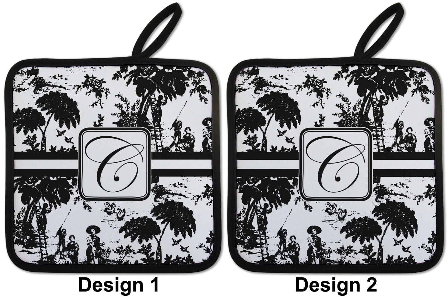 Our personalized pot holders feature a neoprene front that displays your personalization in vibrant colors. The backing of the hot pot holder is rubberized; the textured backing allows you to have a great grip when using this custom pot holder. The two materials are joined with a sleek, black trim, and the holder also includes an attached loop for hanging and storage. The pot holder is approximately 8.75 inches by 8.75 inches and 0.25 inches tall, while the fabric loop is 2.5 inches long. You can purchase a kitchen pot holder by itself or as a set of 2. We also offer a set including one pot holder and one oven mitt.
