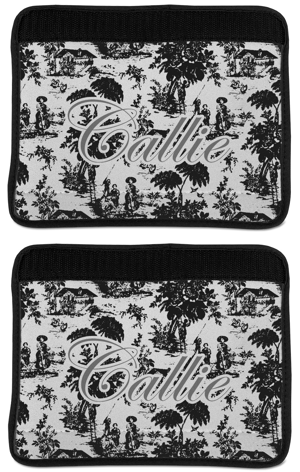 Made from neoprene, our seat belt strap covers wrap around the belt itself and have a Velcro tab for easy attachment and closure. The belt's edges are trimmed with a black polyester for a secure finish. Each cover is 9.5 by 7 inches when open and 9.5 by 2.5 inches when closed. We print your personalized design on the face of the seat belt pad.