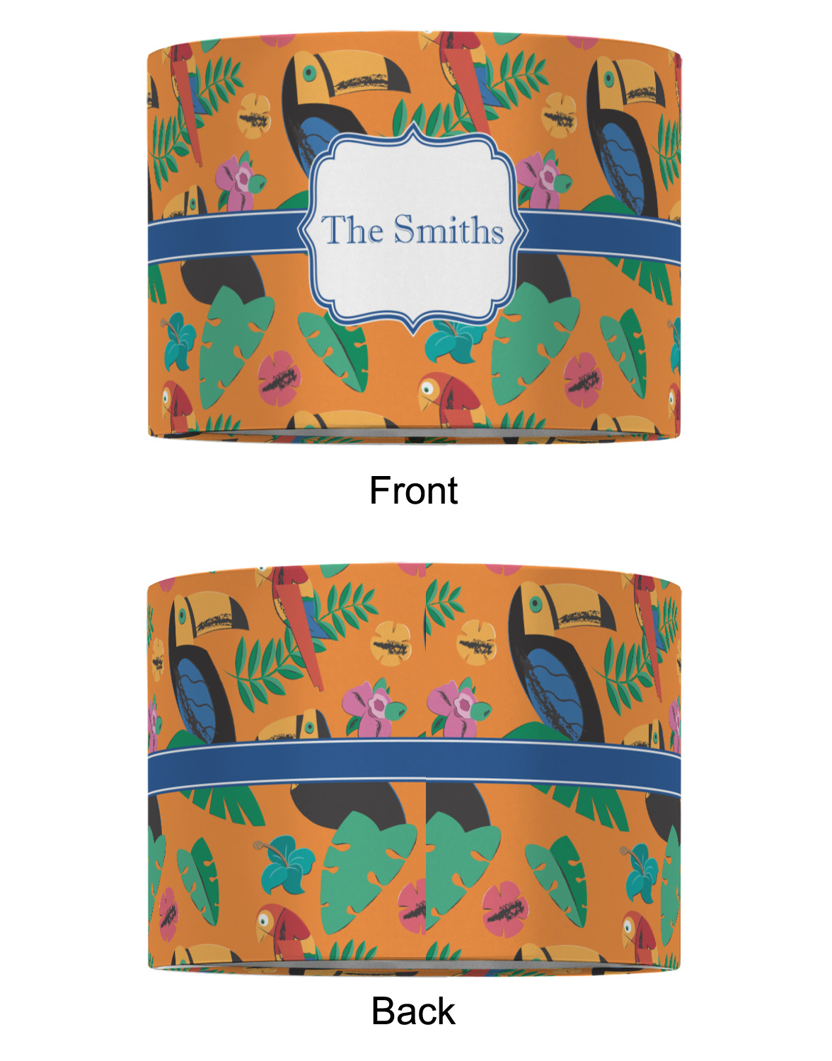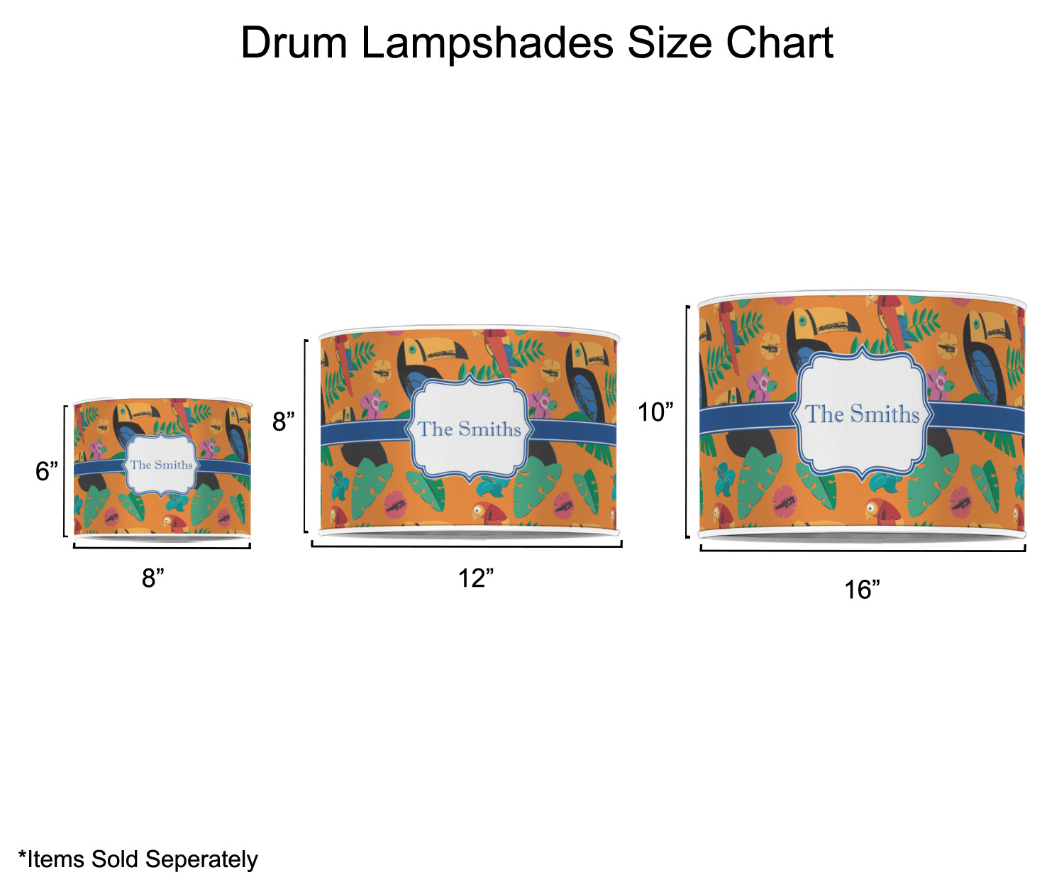 Our customized lamp shades also come in 3 different sizes: 8", 12" and 16", measuring at 8" in diameter by 6" tall, 12" in diameter by 8" tall, and 16" in diameter by 10" tall, respectively.