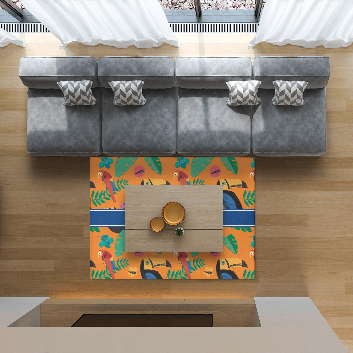 What's more classic Hawaiian than orange, rainbow-colored parrots, toucans, and flirty flowers? This bright design will send you straight back to better days, spent lounging on a beach in some tropical paradise.
