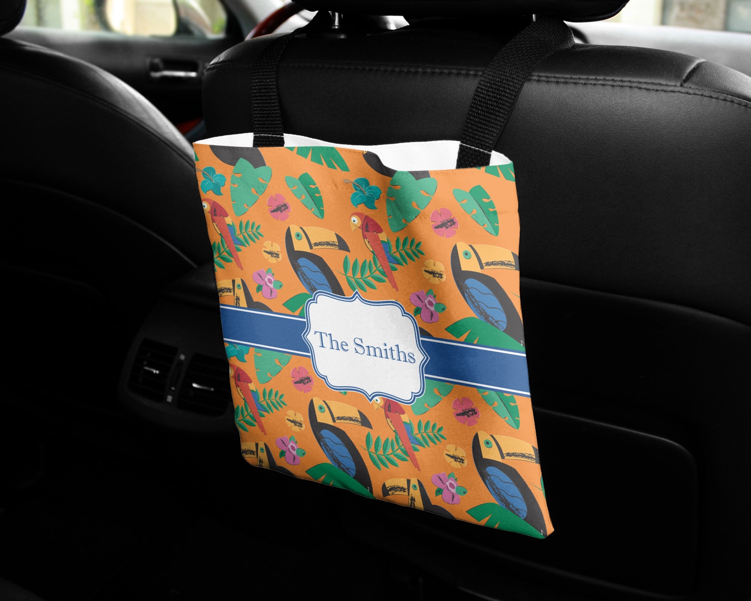 These car back seat organizers are sturdy tote-like bags, fabricated from a robust polyester, and features a single handle on the back side. The strap features an attachable velcro for easy attachment to headrests, grocery carts, car seats, and more. Simply undo the velcro, loop the strap around the headrest, reattach the velcro, and let the organizer hang from the front seat. These car organizers are the perfect means of increasing your backseat's legroom, while storing multiple items in one place for better accessibility. Each car back seat organizer measures at 10 by 10 inches, and features your personalized design printed across its front and back.
