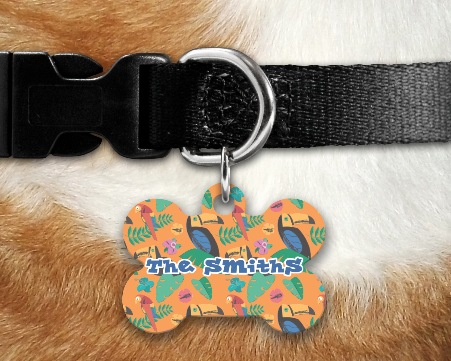 Our default design templates print your dog's personalization on the front and your contact information on the back; however everything is customizable, so you customize the patterns, the colors, the personalization, the contact information etc.