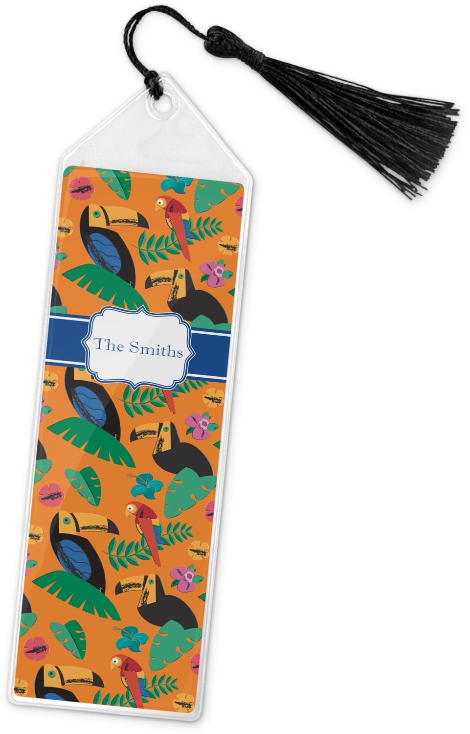 Your personalized bookmark is made of a sturdy, clear vinyl, and is approximately 7.5" x 2.25". We display your personalization on vinyl inserts that are placed on both sides. Accompanying each book marker is a black, fringe tassel that attaches to the reinforced, triangular header.