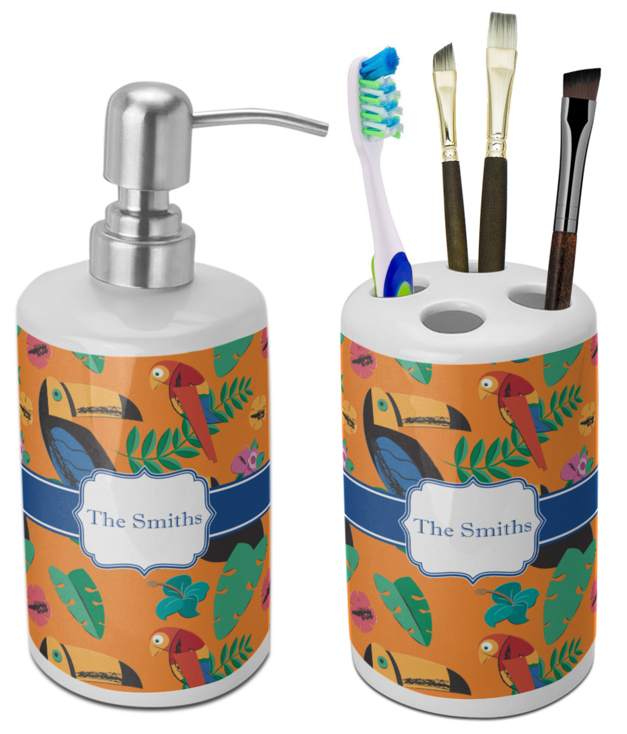 This two piece, ceramic bathroom set will add the perfect splash of color to any bathroom. This set includes one pump dispenser, ideal for soap or lotion, and one toothbrush holder with four holes. Although originally designed for toothbrushes, the holder will also hold make-up brushes, nail files, and other bathroom tools.