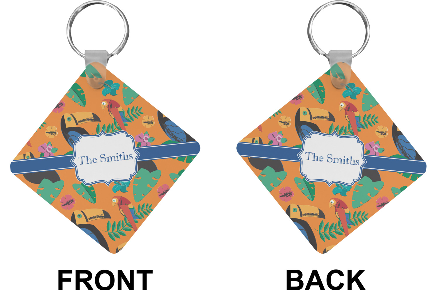 Our personalized keychains attach to the included metal, split key ring with a plastic, removable snap. Since a metal ring is included with your purchase, you have the liberty to keep your keys together on the ring, with or without your unique keychain. We offer this keychain in three different shapes: circle, heart, or diamond. We print your personalized design(s) on both sides of the key chain, and the surface has a glossy, reflective finish that only emphasizes your design. Each keychain is approximately 2.25 by 2.25 inches.