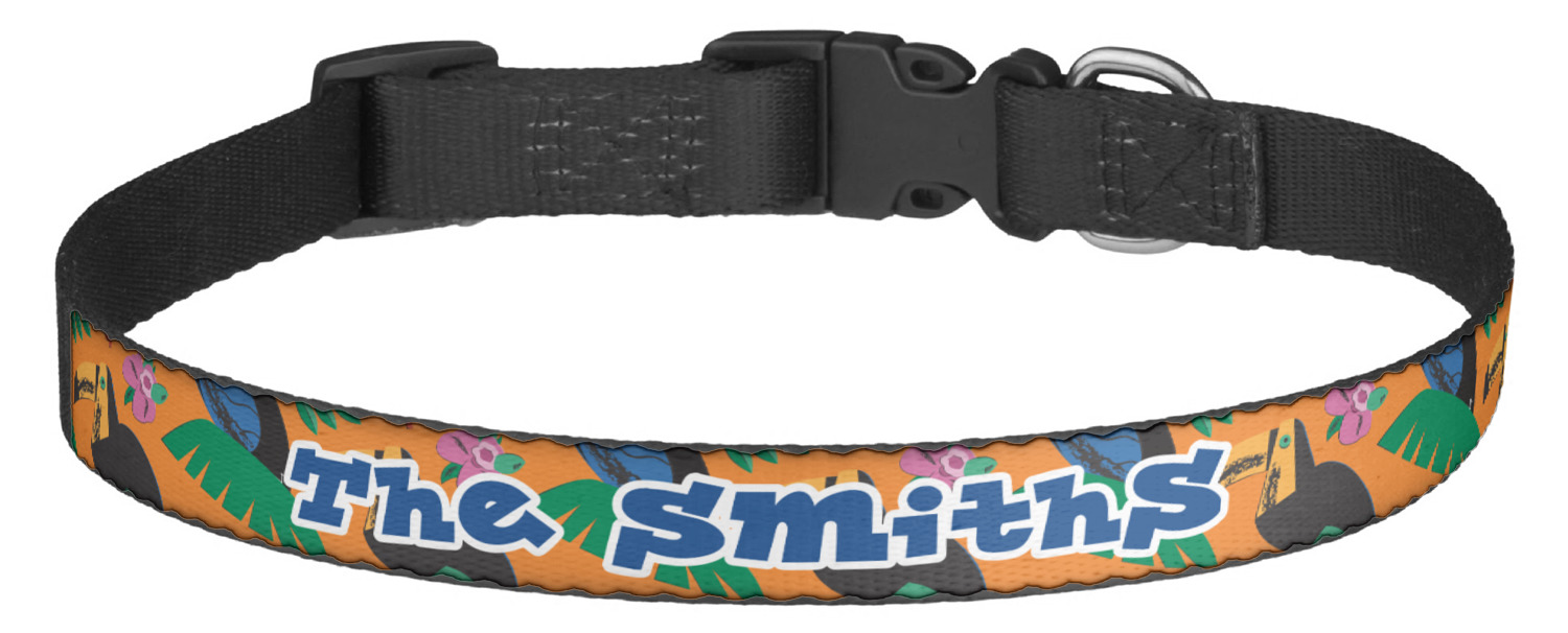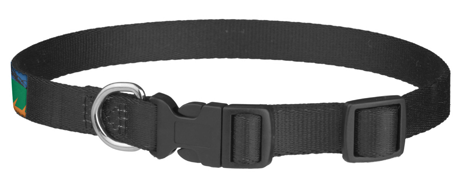 This sturdy collar, made from a durable nylon weave, will outlive your dog's episodes of excited tugging and pulling. Courtesy of its thick plastic buckle and adjuster, this collar is adjustable and accommodating of any dog. Structurally, the collar is a single piece of nylon weave that is sewn together, and features a solid metal loop where you can attach a leash or dog tag. We print and display your dog's name and pattern across the middle of the personalized dog collar.