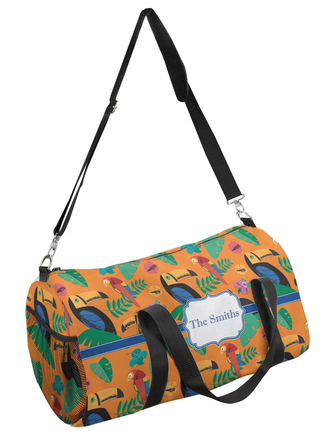 This duffle is a sturdy bag made of a canvas material. It comes in two sizes: Small (19"W x 9.5"H x 9.5"D) and Large (23"W x 12"H x 12"D). The bag is a cylindrical shape with a black adjustable strap and two handles. On one side is an elastic pouch to put a waterbottle or other small item. Your product will be sublimated with your design and is able to be designed on the front, back, and sides. Be sure to remember that the straps may cut into parts of your design if you upload your own artwork.