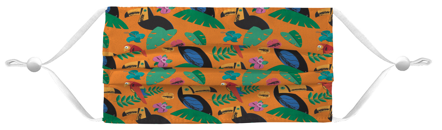 These fun face masks are 7" wide and 3.5" high. They feature pleats, adjustable ear loops, and are made with two layers of fabric. The top layer where your design is printed is a breathable polyester sheeting, while the inside layer is a soft microfiber polyester