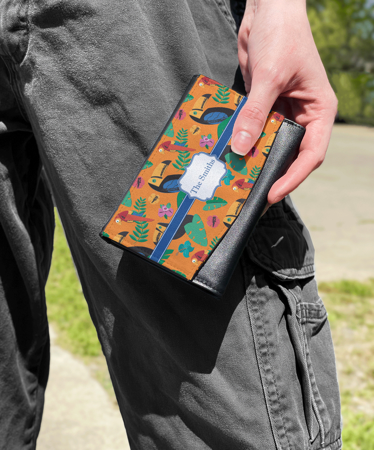 The compact size of this wallet - 5.5in wide, 3.5in tall and 0.75in thick when folded - makes it perfect to hold in hand and small enough to fit in a clutch or a normal size purse. The outside flap is customized with your choice of artwork and closes with a snap closure - with two different snaps to allow it to be adjusted when storing more items - to securely fasten the flap.