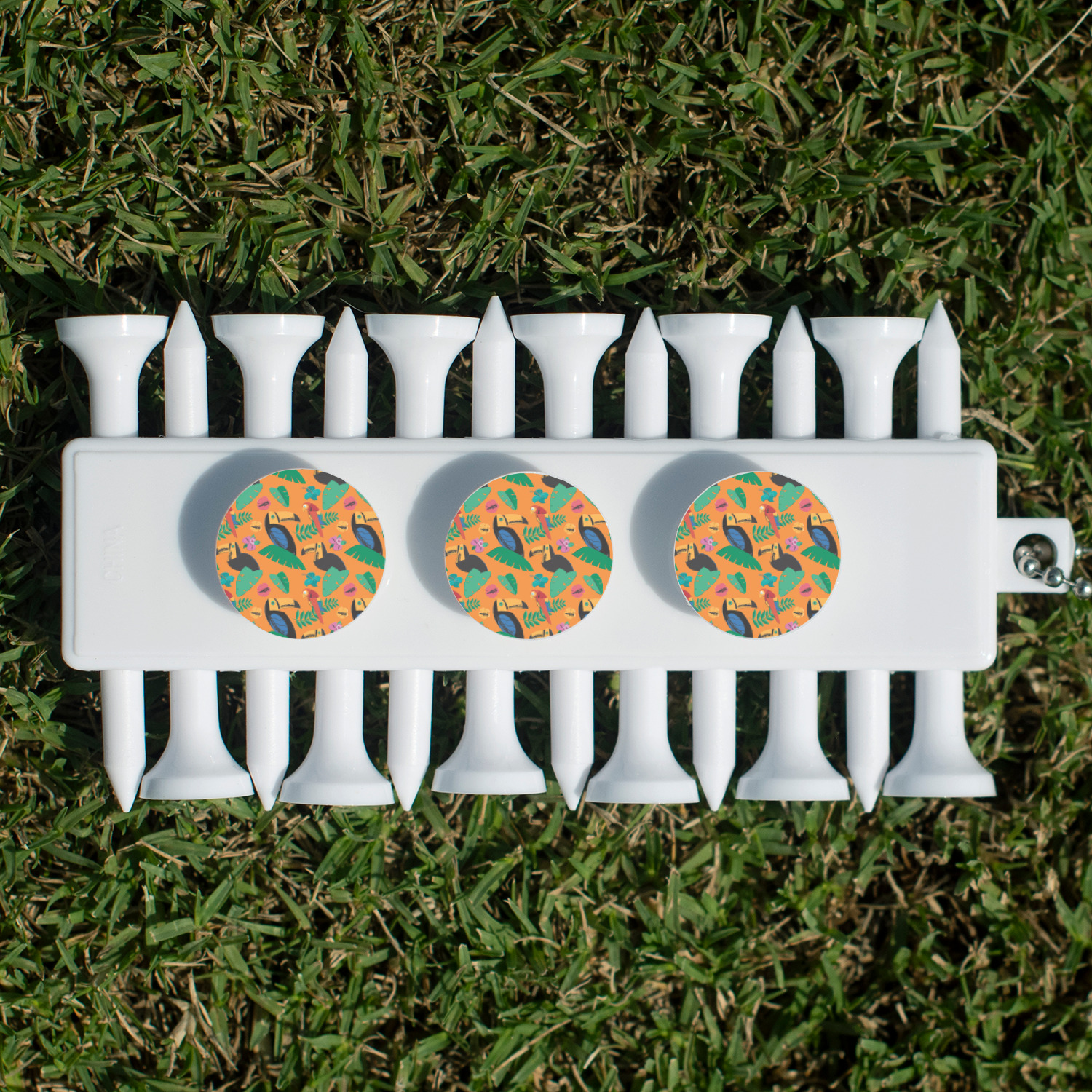 With 12 tees on a lightweight, portable key chain, it almost ensures a great 18 holes. Our tees are made of white plastic and are a little over 2". Design the front and the back of the golf tee holder. Pick from over a hundred designs, colors, and personalization styles! The set even comes with three removable ball markers as well!