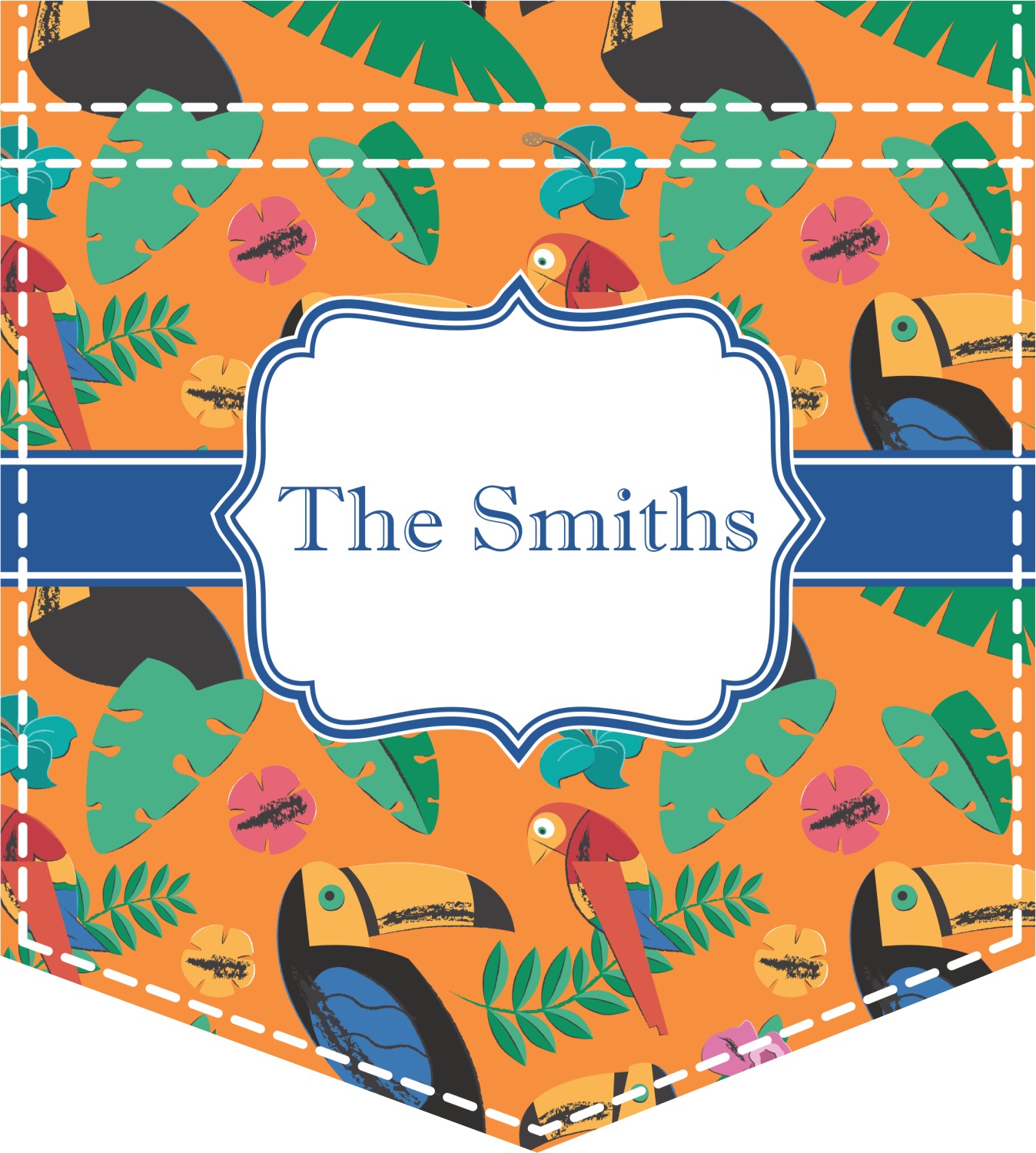 Our no sew faux pockets are easily customized by you. Our customization system allows you to change the personalization from a name to a monogram or to a name & initial or remove it completely. You can also change the colors, fonts, graphics, backgrounds etc. You can also upload your own picture / image or logo or we can custom create one for you or your event.
