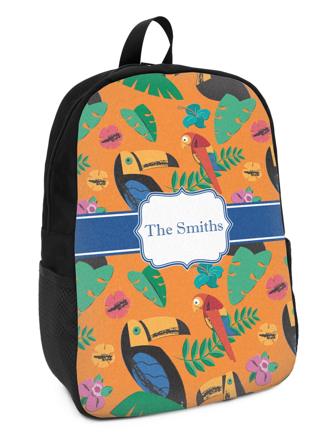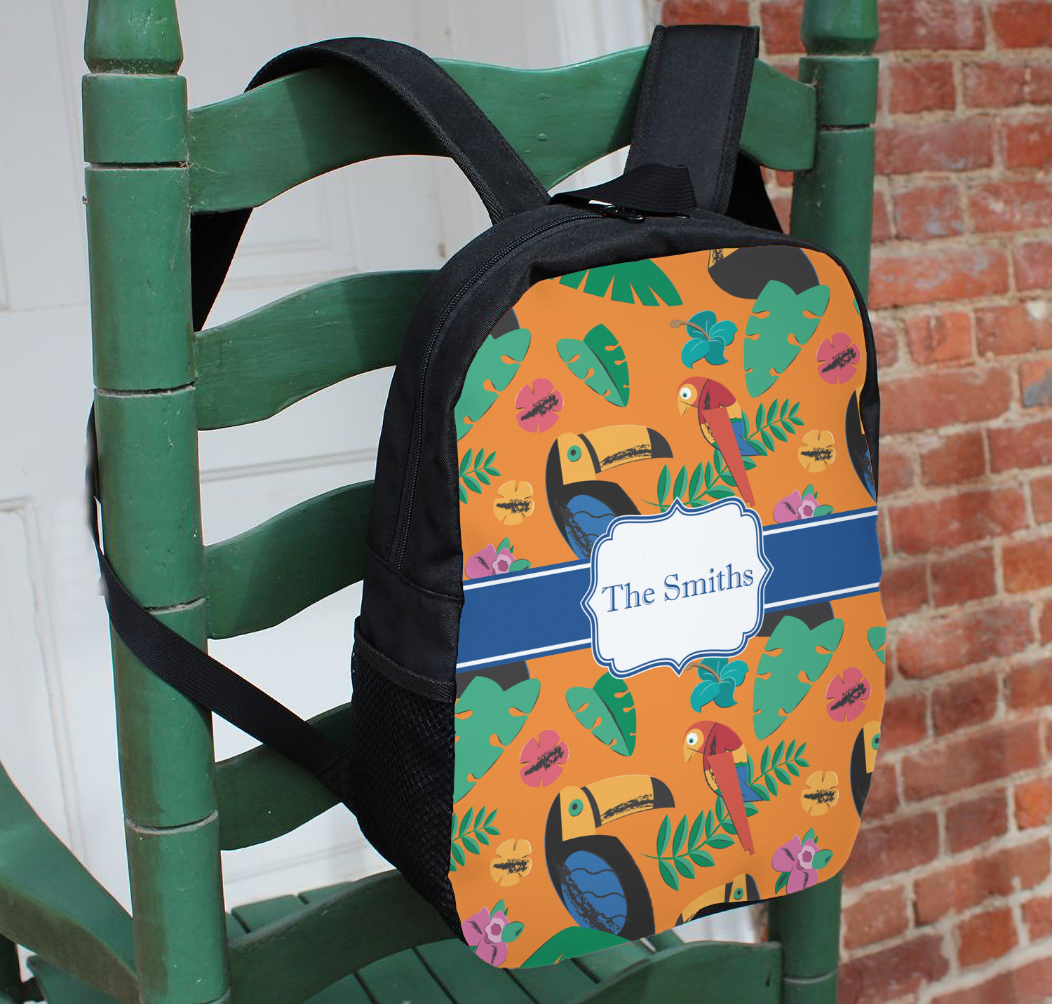 These small backpacks are made of a durable black canvas material with your personalization right on the front. The two shoulder straps are padded and easily adjustable. The bag itself measures at about 11" W x 15" H x 5" D. It's the perfect size for elementary aged kids or adults who want a smaller backpack. On the top of the bag you will find a handle to hang or carry your backpack by as well as a large zipper closure to keep all of your belongings safe inside. On each side of your backpack is a mesh pocket for a small item or water bottle. Inside your backpack you will find a spacious area with a small zipper pocket and a padded laptop slot that will fit up to a 13" laptop (13" being very snug). This is the perfect bag for any student that needs a couple books and their laptop with them at all times. It also works great as a carry on for traveling!