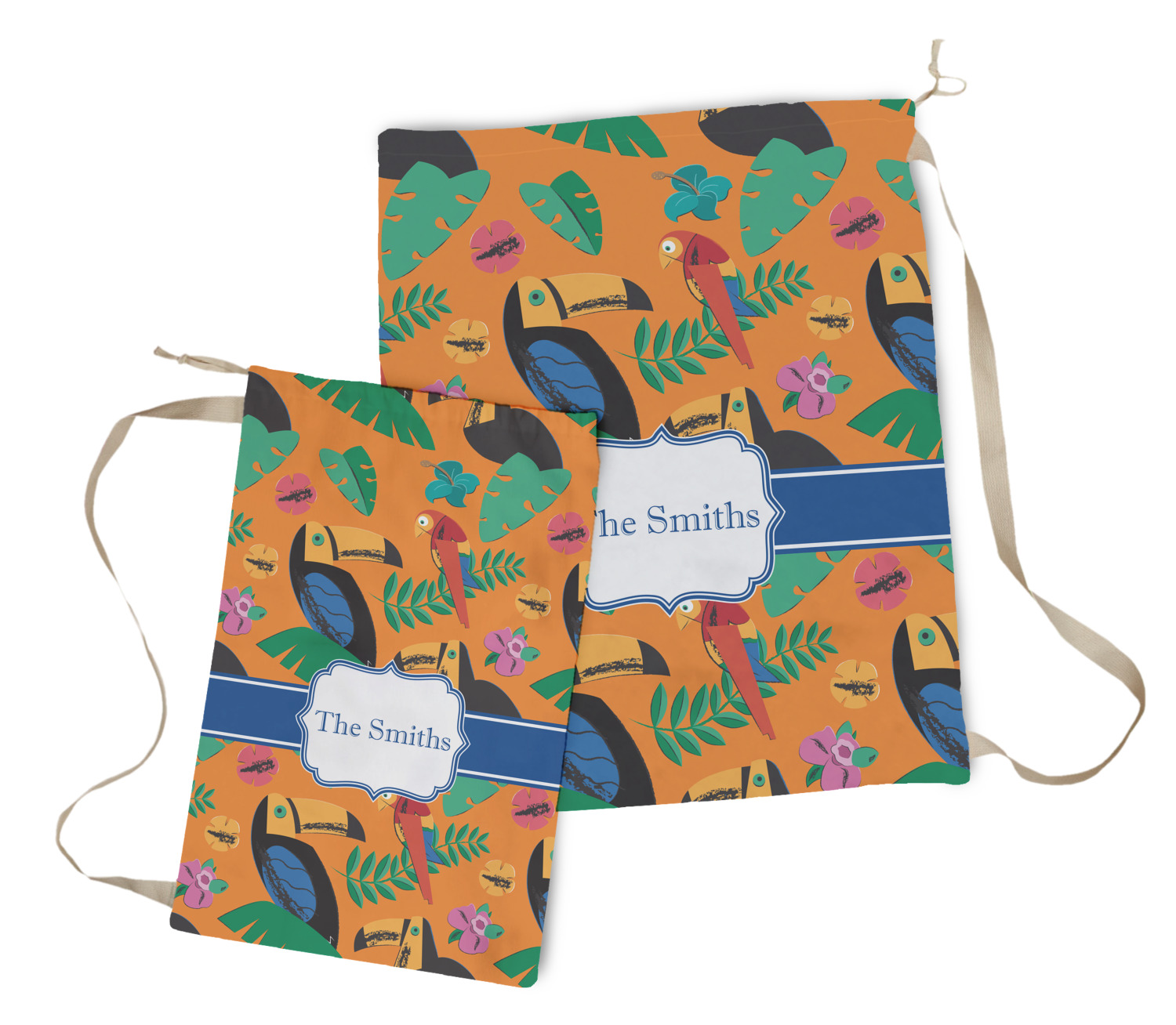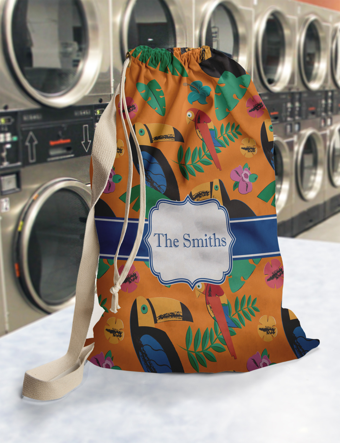 Carry your laundry in style with these customized laundry bags. Available in two sizes, featuring a natural colored woven strap and a cinch cord, these bags hold a lot of clothes or anything else you want to fit in them.