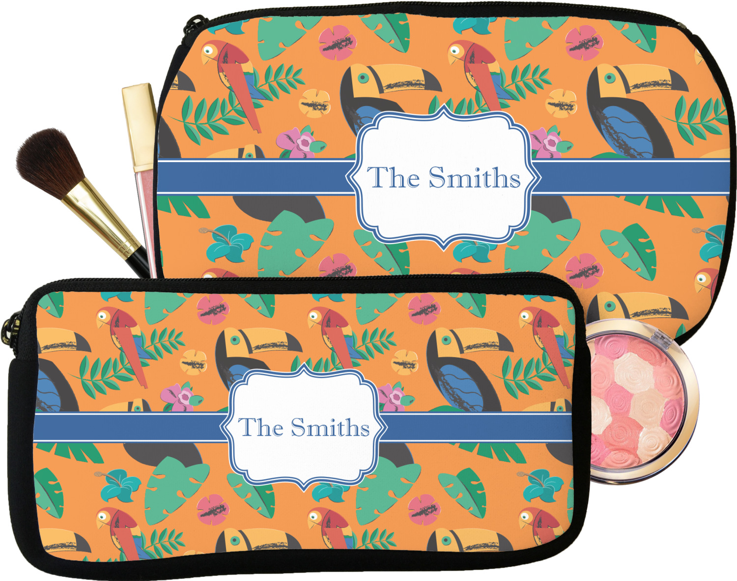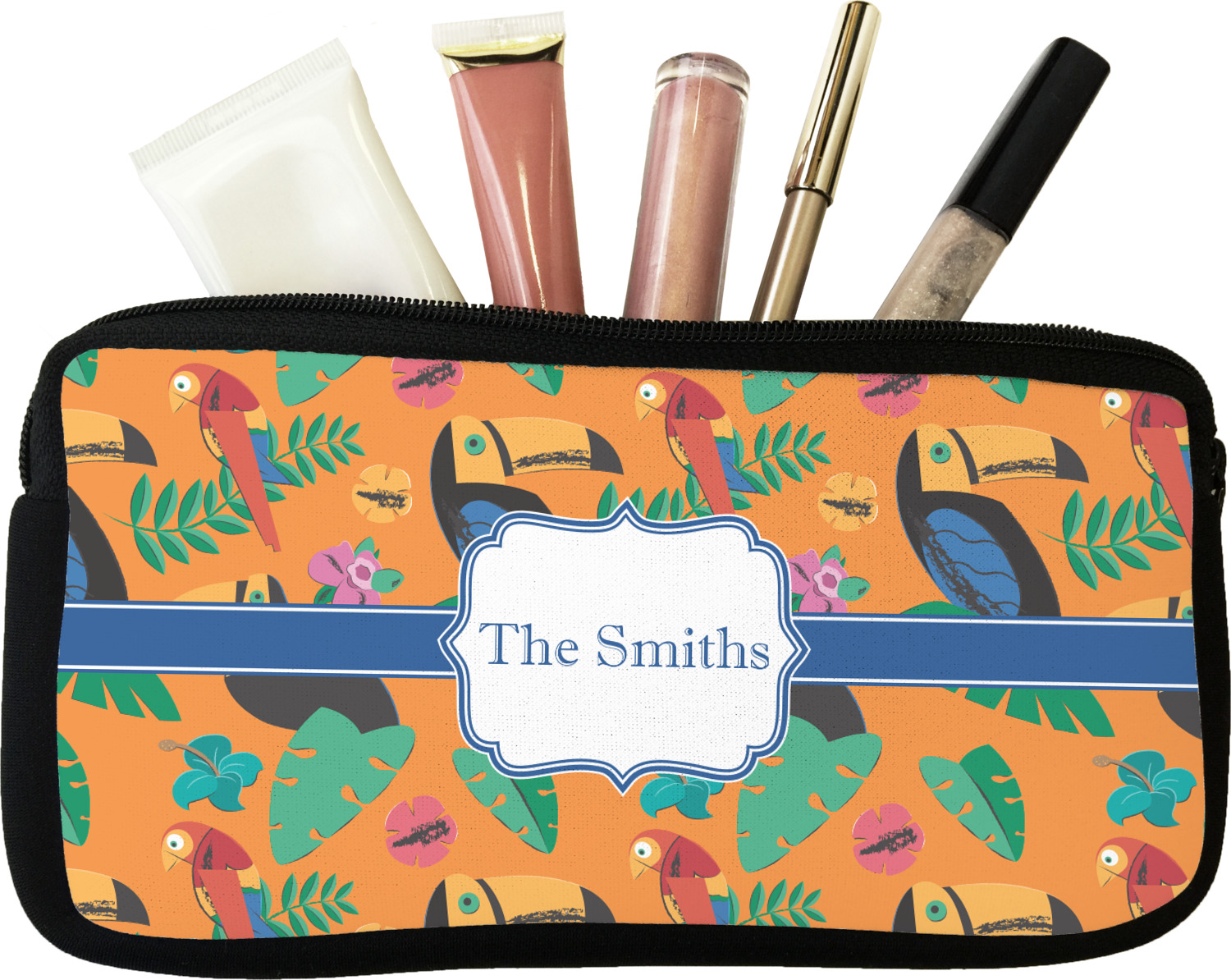 Our personalized makeup bags are available in many different designs, patterns and colors - so you are sure to find one that will love. They are made of neoprene (same material as wet-suits) and thus are water resistant, so spillages in your makeup bag will not end up all over you purse. They are customized on one side and are black on the other side and the zipper is black as well.