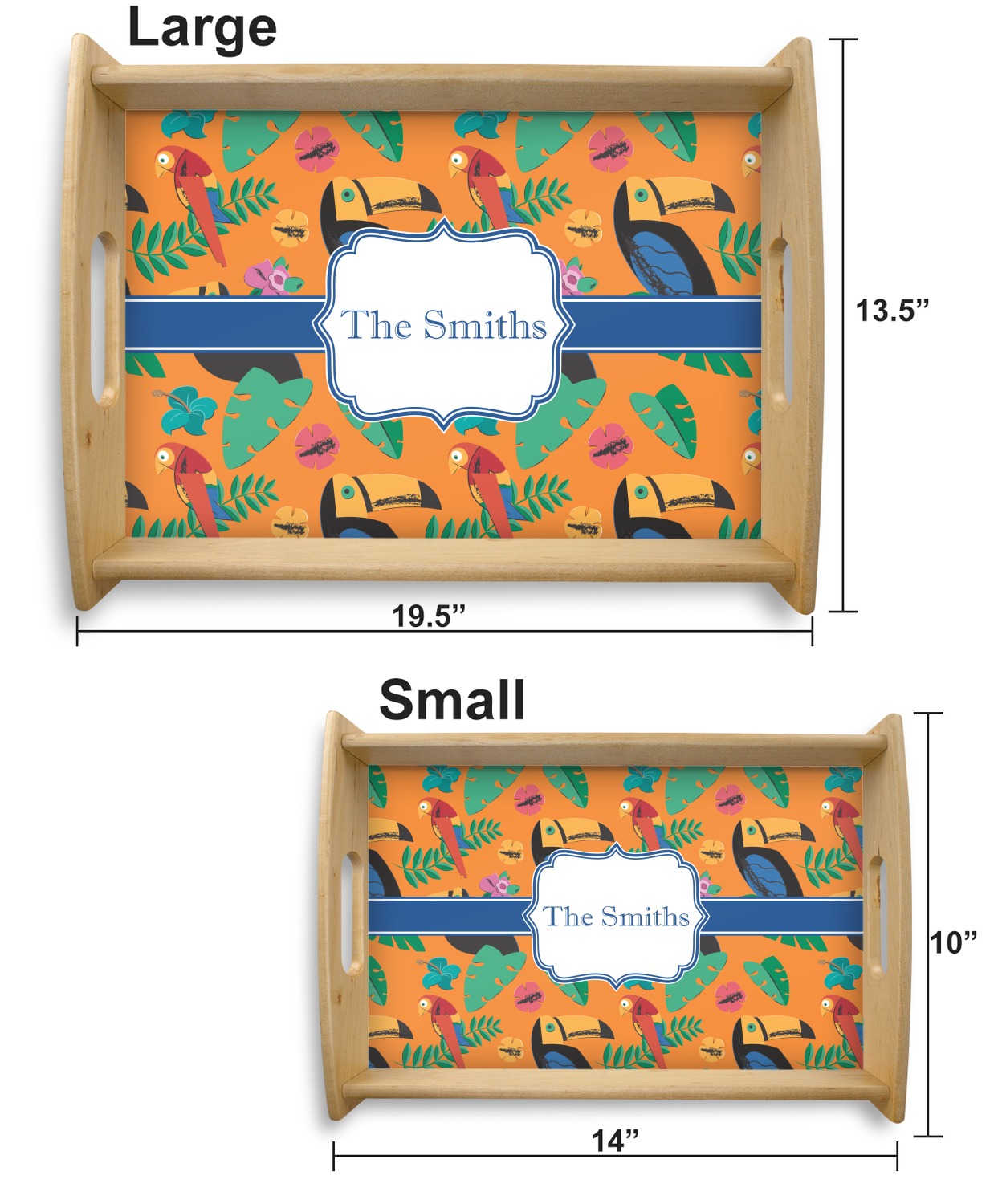 This serving tray with handles features square edges and two rounded sides, creating a very modern look. Each side is fabricated from a beautifully cut, natural wood. The bottom of the interior of the tray displays your customized design in bright, vibrant color. The tray is sold in both a black color and a natural wood look. Each variation of the wood serving tray has two sizes: Small, which is 14" x 10" x 2.25", and Large, which is 19.5" x 13.5" x 2.75".