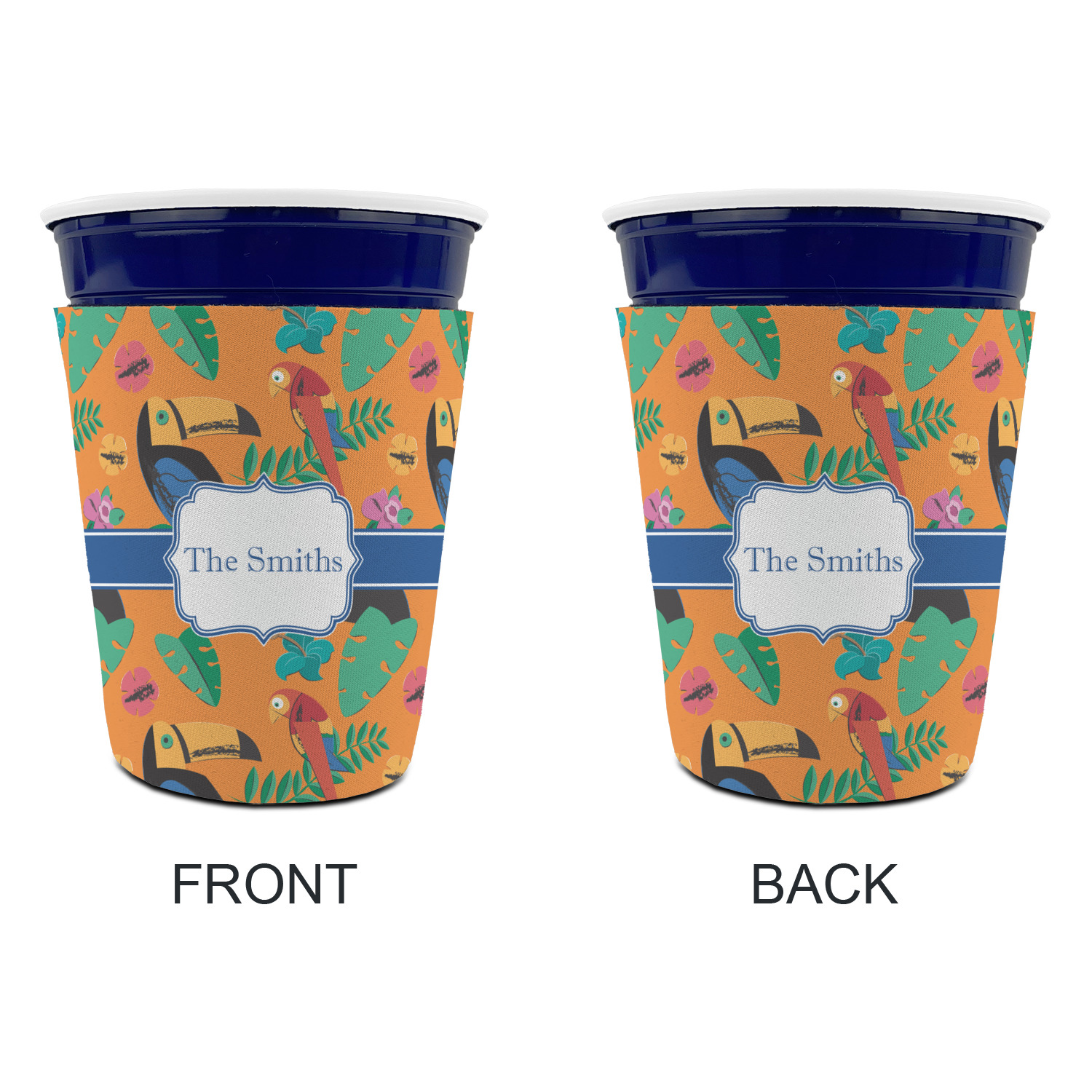 Made from neoprene with a polyester outer fabric and sewn seams, these premium quality party cup sleeves are very durable and will hold up to heavy use. They are available in 2 styles - with a bottom or just a sleeve to go around the outside of the tapered cup. The sleeve covers are about 4" tall and cover about 90% of the classic 16 oz. Solo cup.