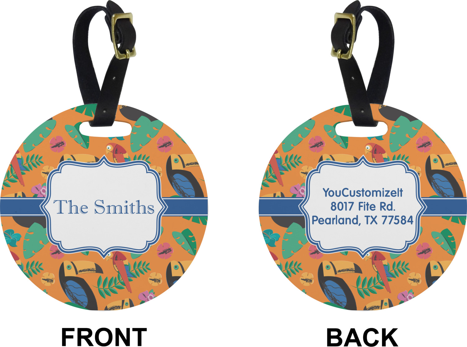 These personalized bag tags are sold in a variety of shapes, so that you may find the product that meets your vision exactly. We sell a round luggage tag, which measures at approximately 4" x 4". Our square luggage tag is about 3.5" x 3.5", while our rectangular version is 2.75" x 4 ".