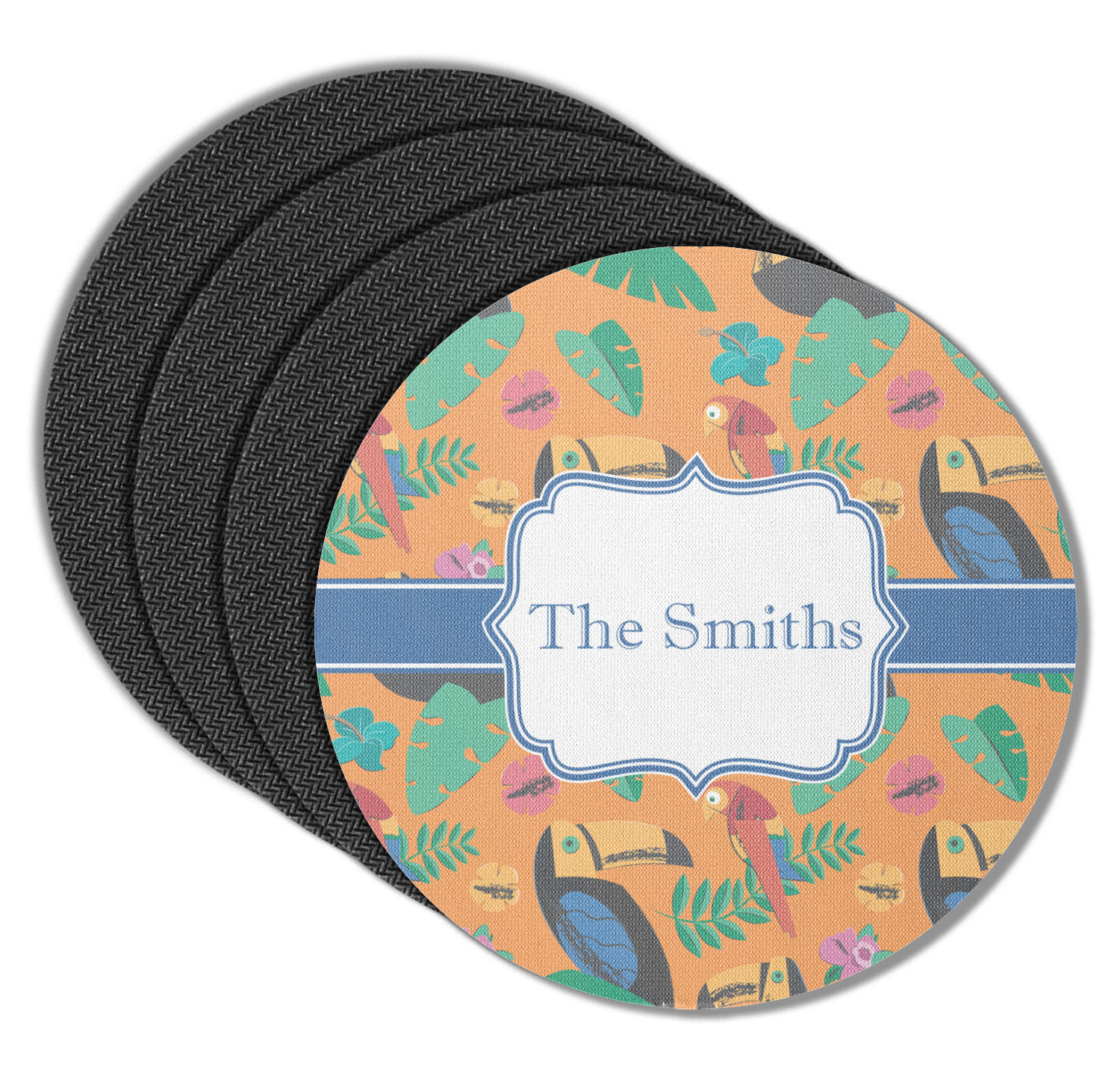 These drink coasters have a smooth, polyester top and a textured, rubber backing on its bottom. The non-slip rubber backing underneath works to keep any spills at bay. At 4 by 4 by 0.25 inches thick, these custom coasters are a suitable size for most drinkware. Your personalization is displayed atop the face of the cup coaster. We sell these rubber coasters in two different shapes: square and round. You can buy each shape as singulars or as a set of 4.