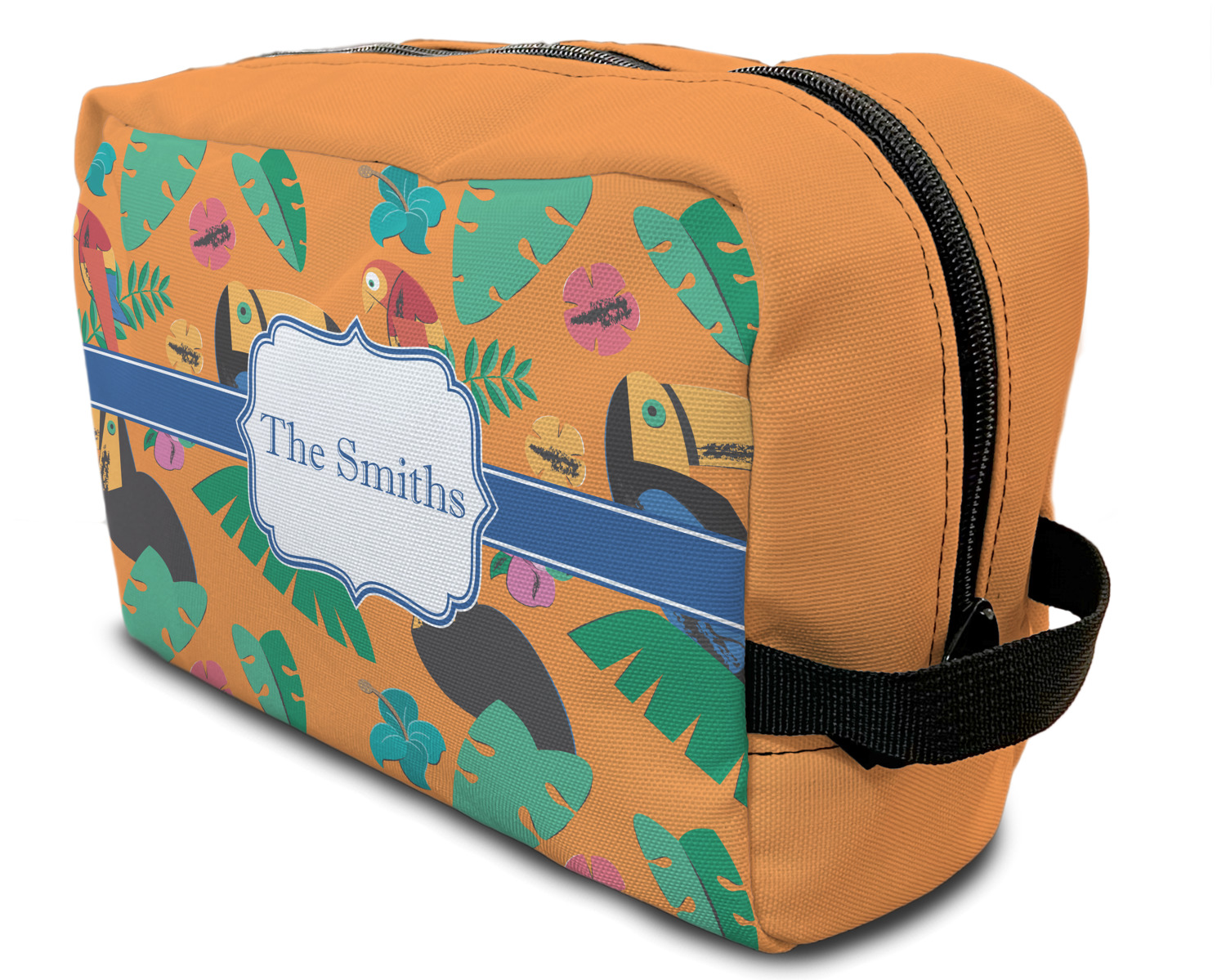 Our toiletry bag has the traditional dopp kit design i.e. a side to side zippered closure, giving you easy access to all the contents inside and a sturdy handle on one side of the bag. The canvas fabric for dopp kits is printed, then cut and sewn here in the USA.
