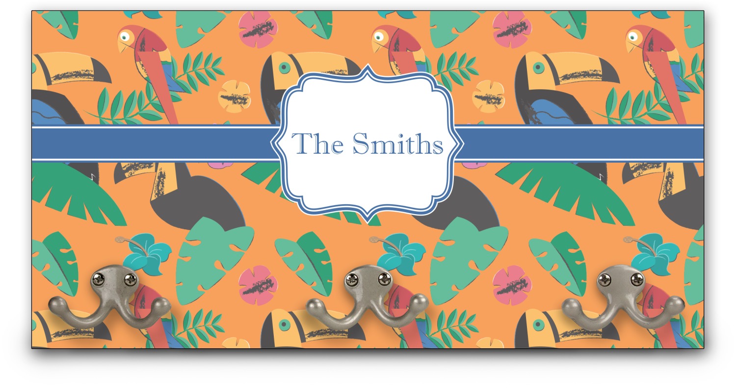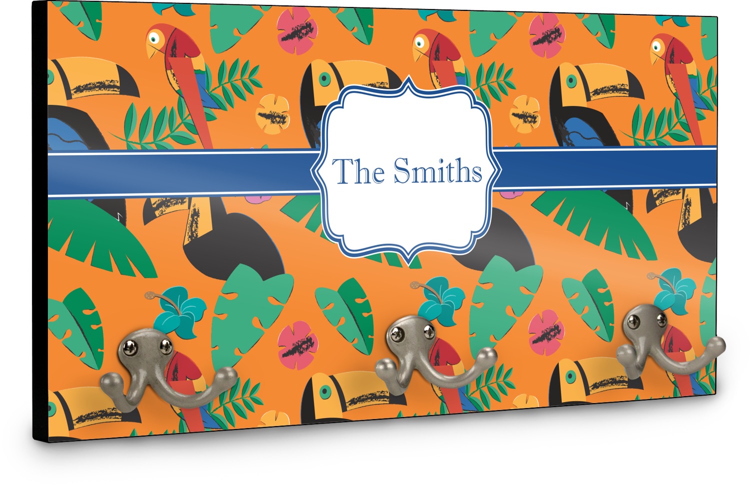 This coat rack is the perfect way to add some personality to your wall or entryway. The board is made of a strong maple that is approximately 16" x 8". The three 2-prong hooks are a sturdy metal that have three screws attaching them to the board. Your design is printed right onto the front of the board while the back and sides are a simple black.