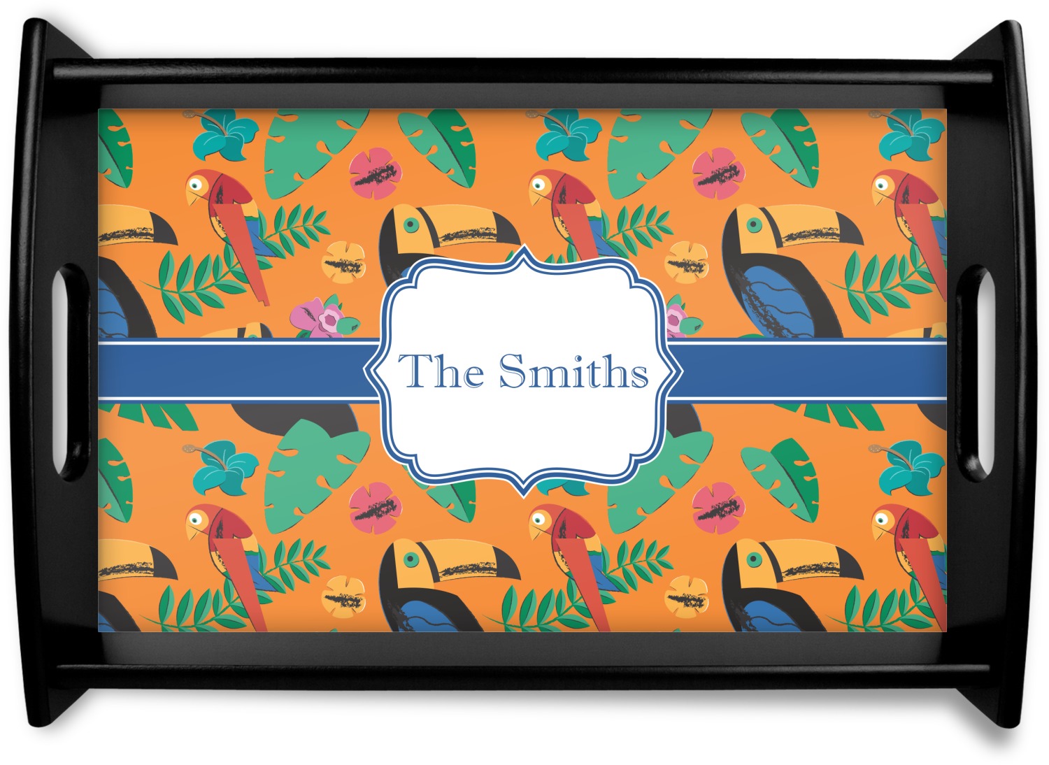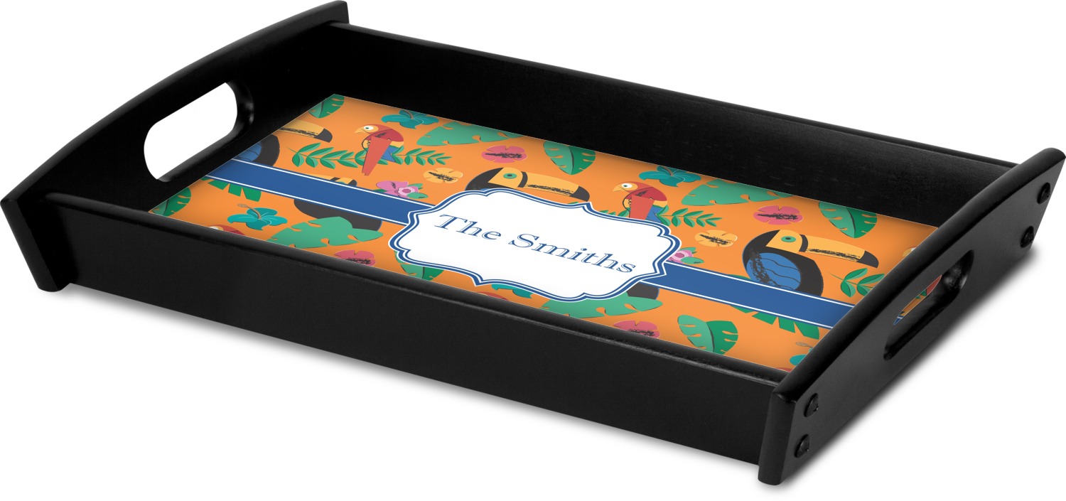 This serving tray with handles features square edges and two rounded sides, creating a very modern look. Each side is fabricated from a beautifully cut, natural wood. The bottom of the interior of the tray displays your customized design in bright, vibrant color. The tray is sold in both a black color and a natural wood look. Each variation of the wood serving tray has two sizes: Small, which is 14" x 10" x 2.25", and Large, which is 19.5" x 13.5" x 2.75".