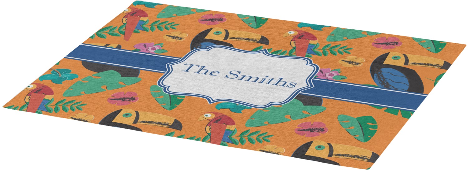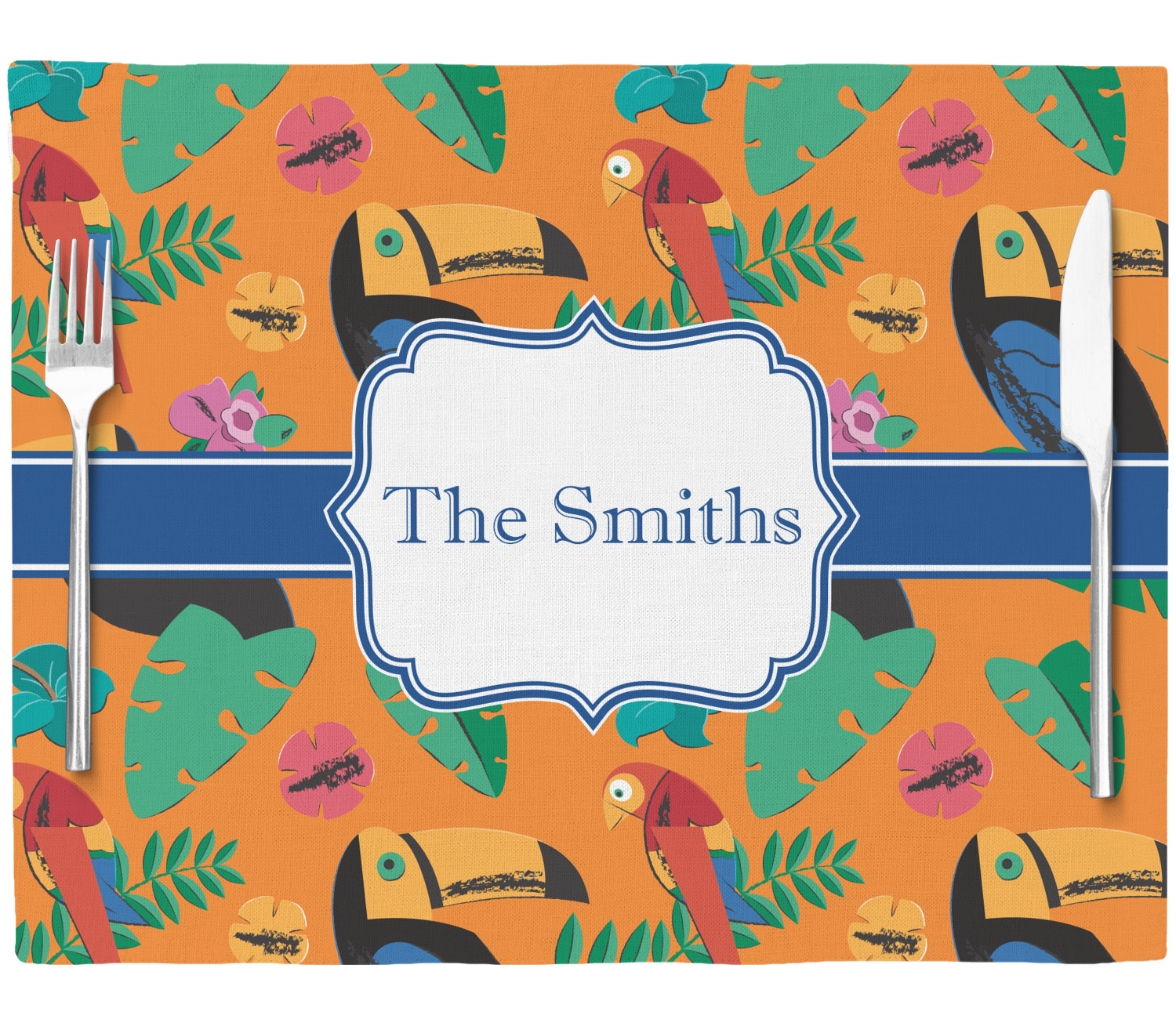 Each of our table mats are a poly twill material with woven burlap detailing. This creates a soft, quality placemat for us to fully print your personalized design across. The woven twill also adds a wrinkle-free surface to set your table! Each customizable placemat is a rectangle shape measuring at approximately 13 x 18 and printed here in the USA.
