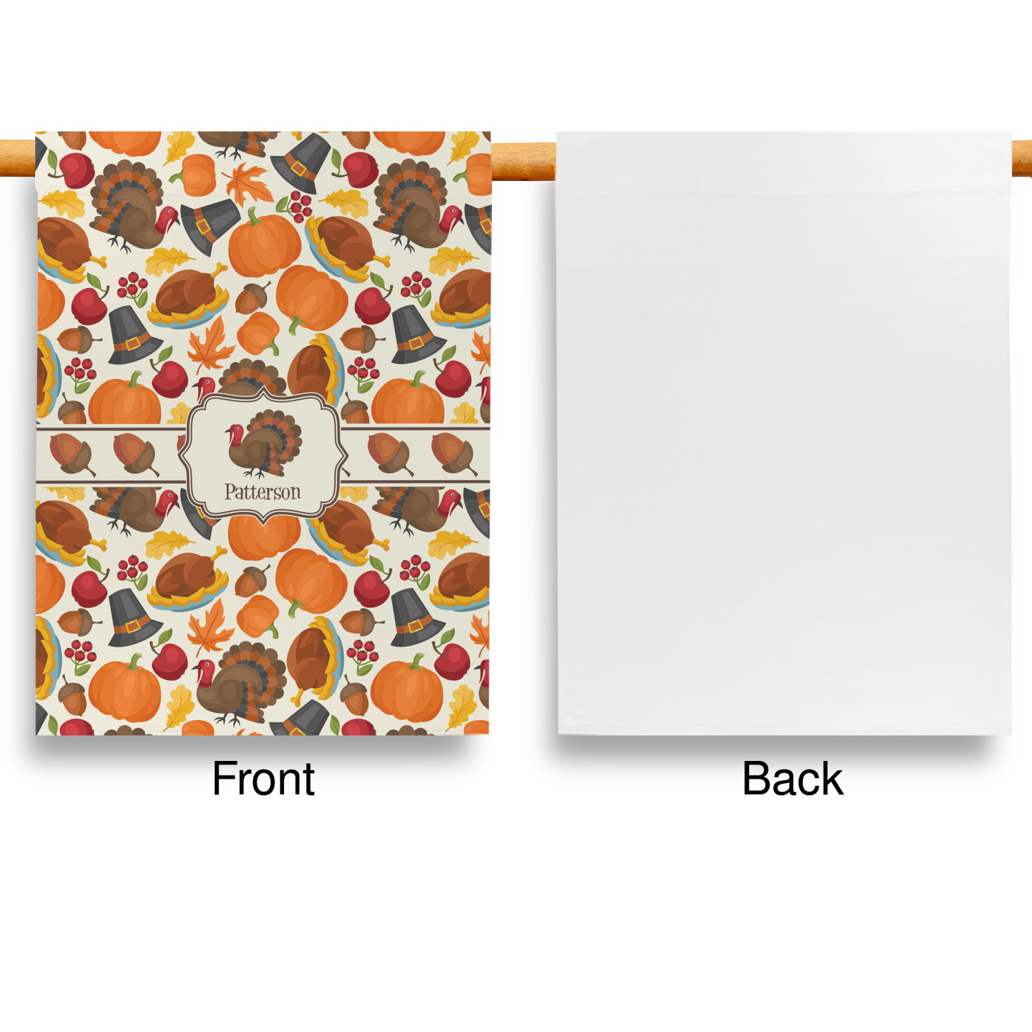This traditional thanksgiving design is perfect for celebrating the season of giving thanks. This classic design includes turkey, pumpkin, pilgirm hat, berries, apples, acorns and leaves. The background on this design is re-color-able; and we chose the light yellow from the fall / thanksgiving color palette in our customization system.