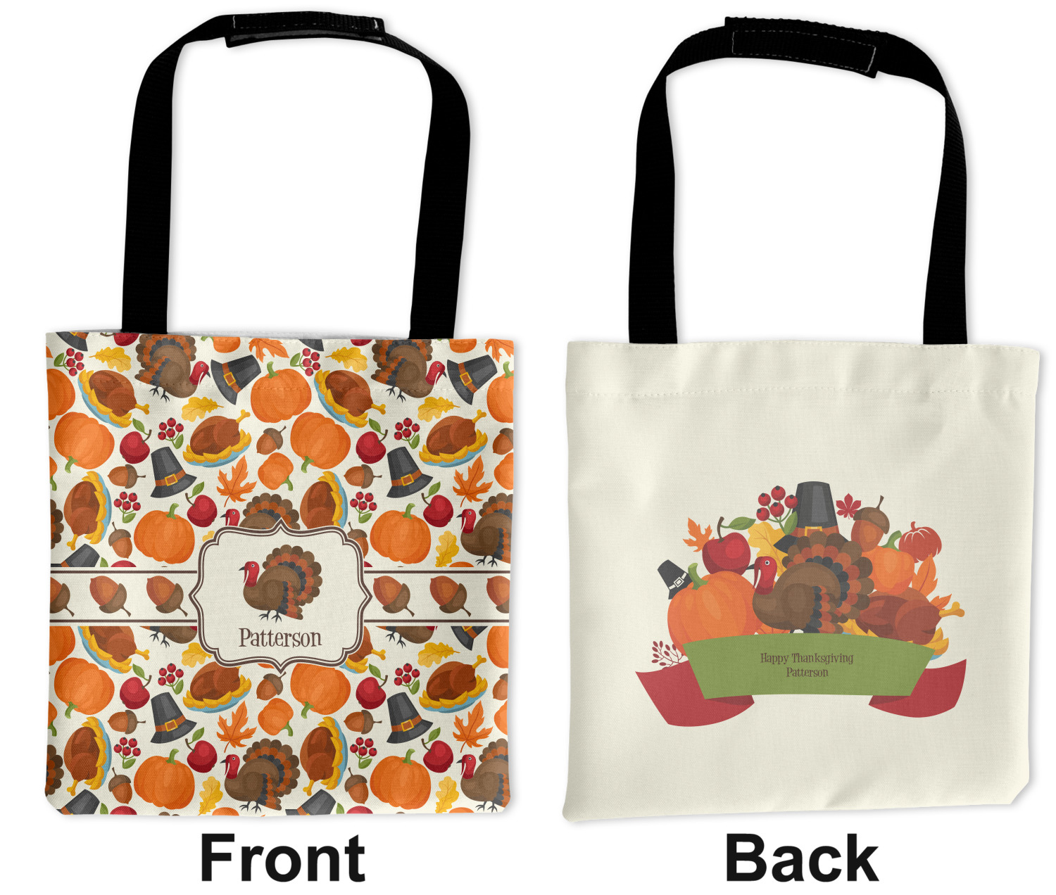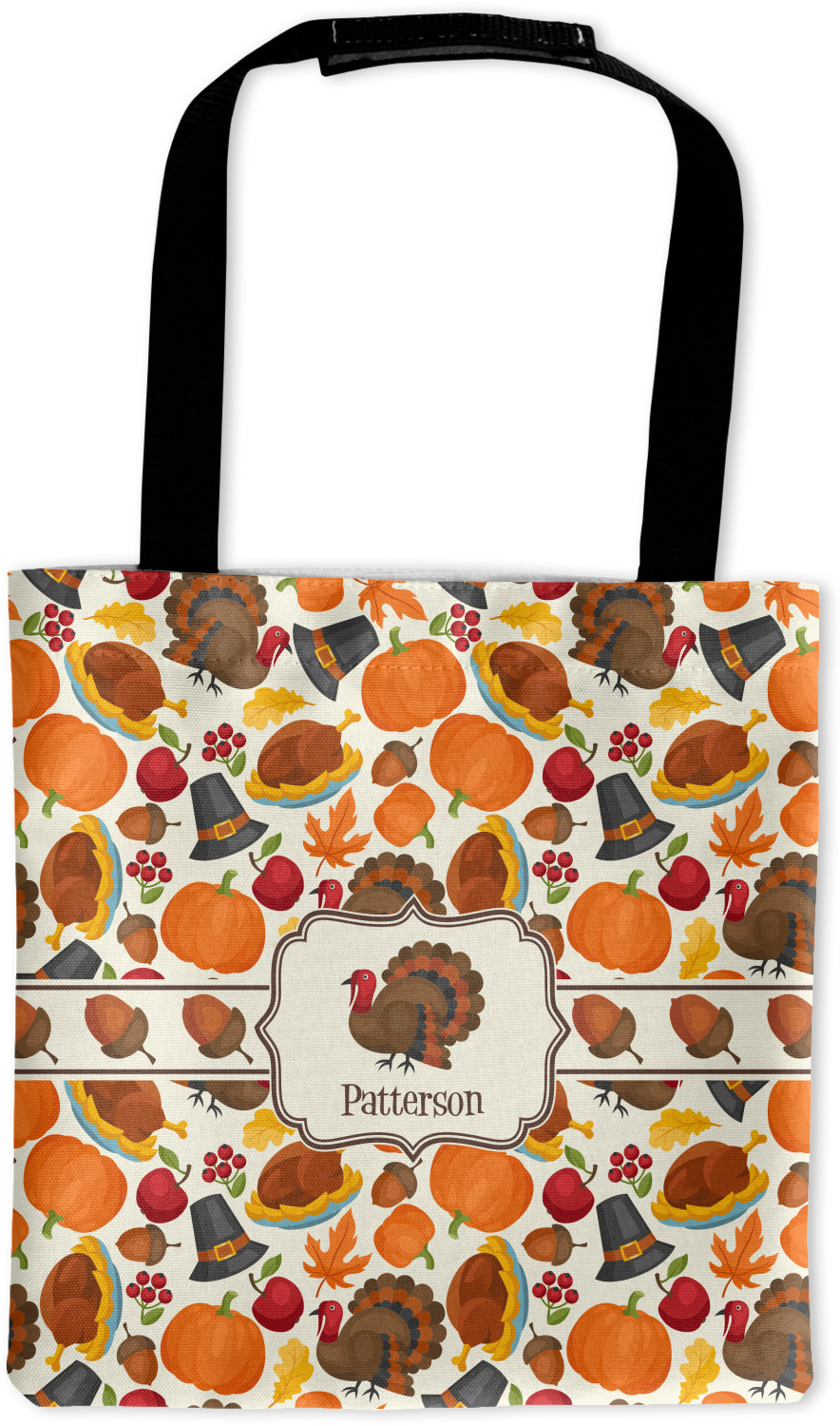 This traditional thanksgiving design is perfect for celebrating the season of giving thanks. This classic design includes turkey, pumpkin, pilgirm hat, berries, apples, acorns and leaves. The background on this design is re-color-able; and we chose the light yellow from the fall / thanksgiving color palette in our customization system.