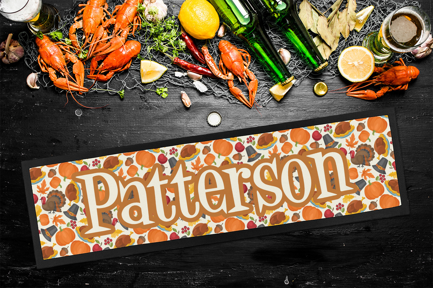 This traditional thanksgiving design is perfect for celebrating the season of giving thanks. This classic design includes turkey, pumpkin, pilgirm hat, berries, apples, acorns and leaves. The background on this design is re-color-able; and we chose the light yellow from the fall / thanksgiving color palette in our customization system.