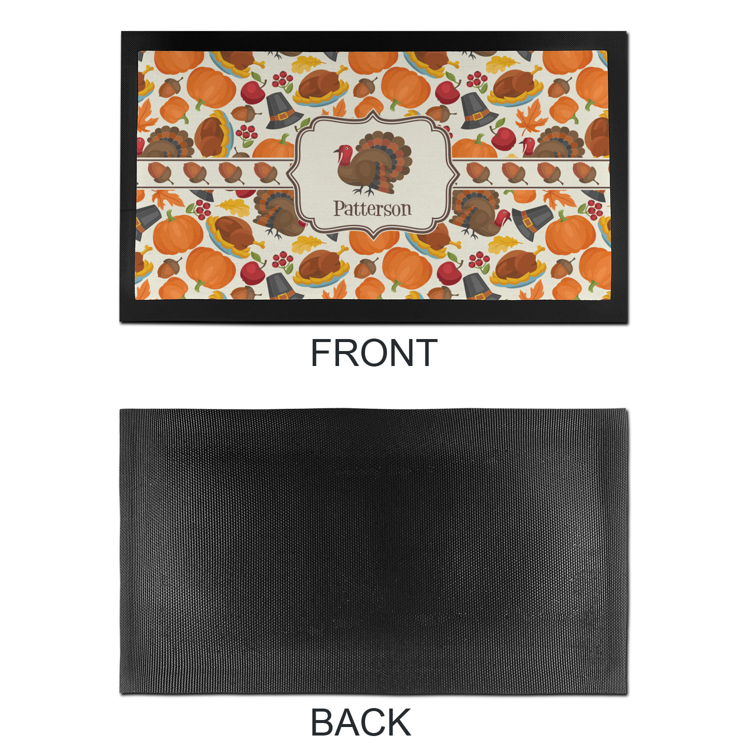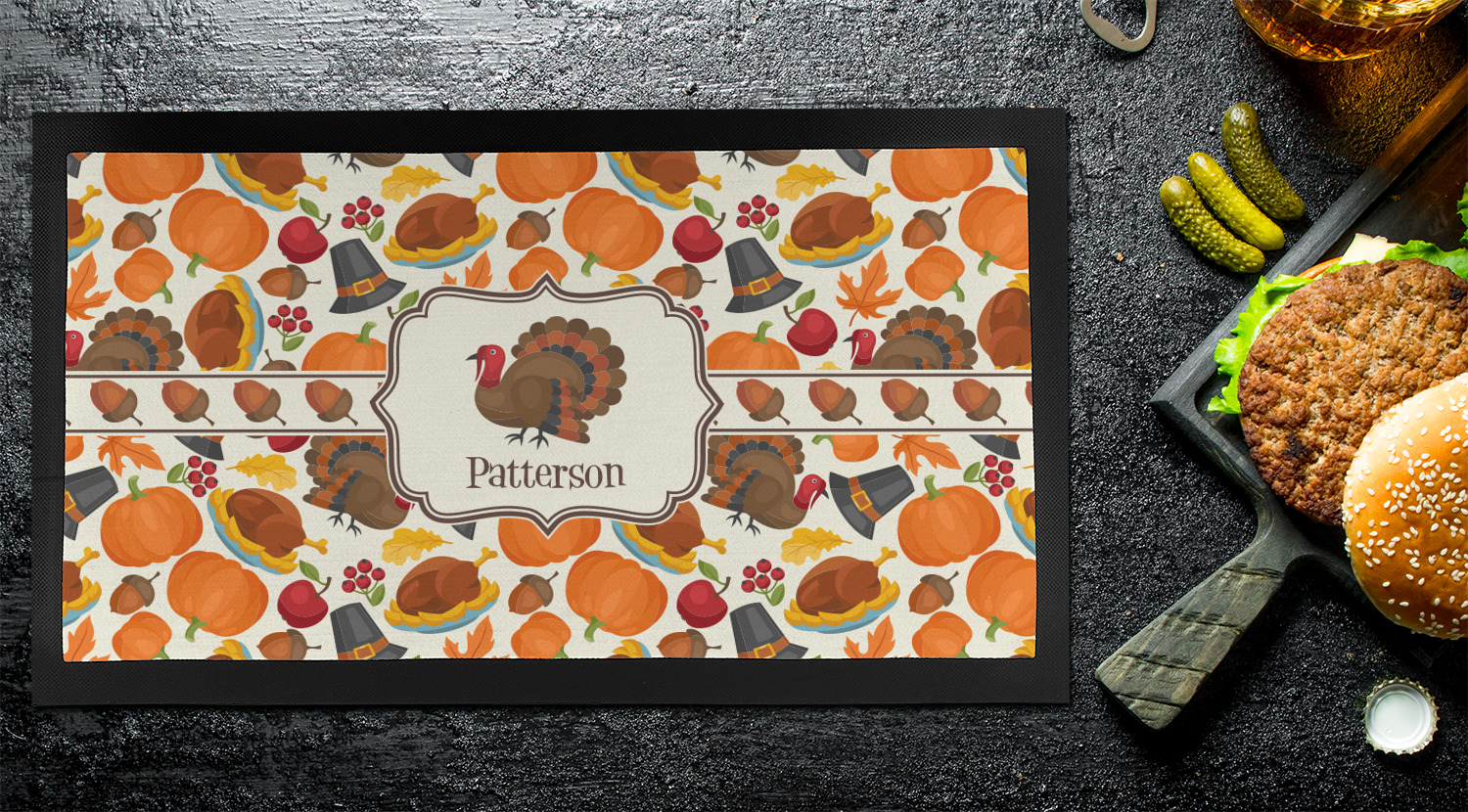 This traditional thanksgiving design is perfect for celebrating the season of giving thanks. This classic design includes turkey, pumpkin, pilgirm hat, berries, apples, acorns and leaves. The background on this design is re-color-able; and we chose the light yellow from the fall / thanksgiving color palette in our customization system.