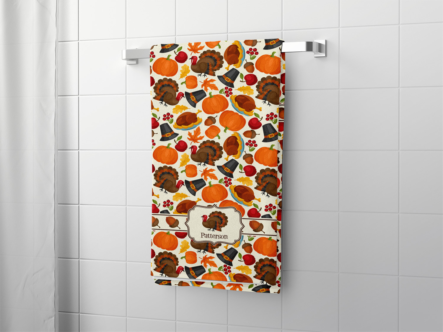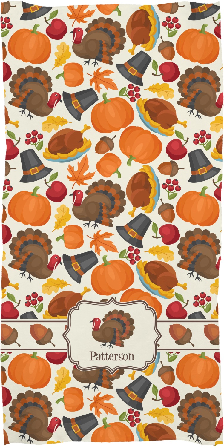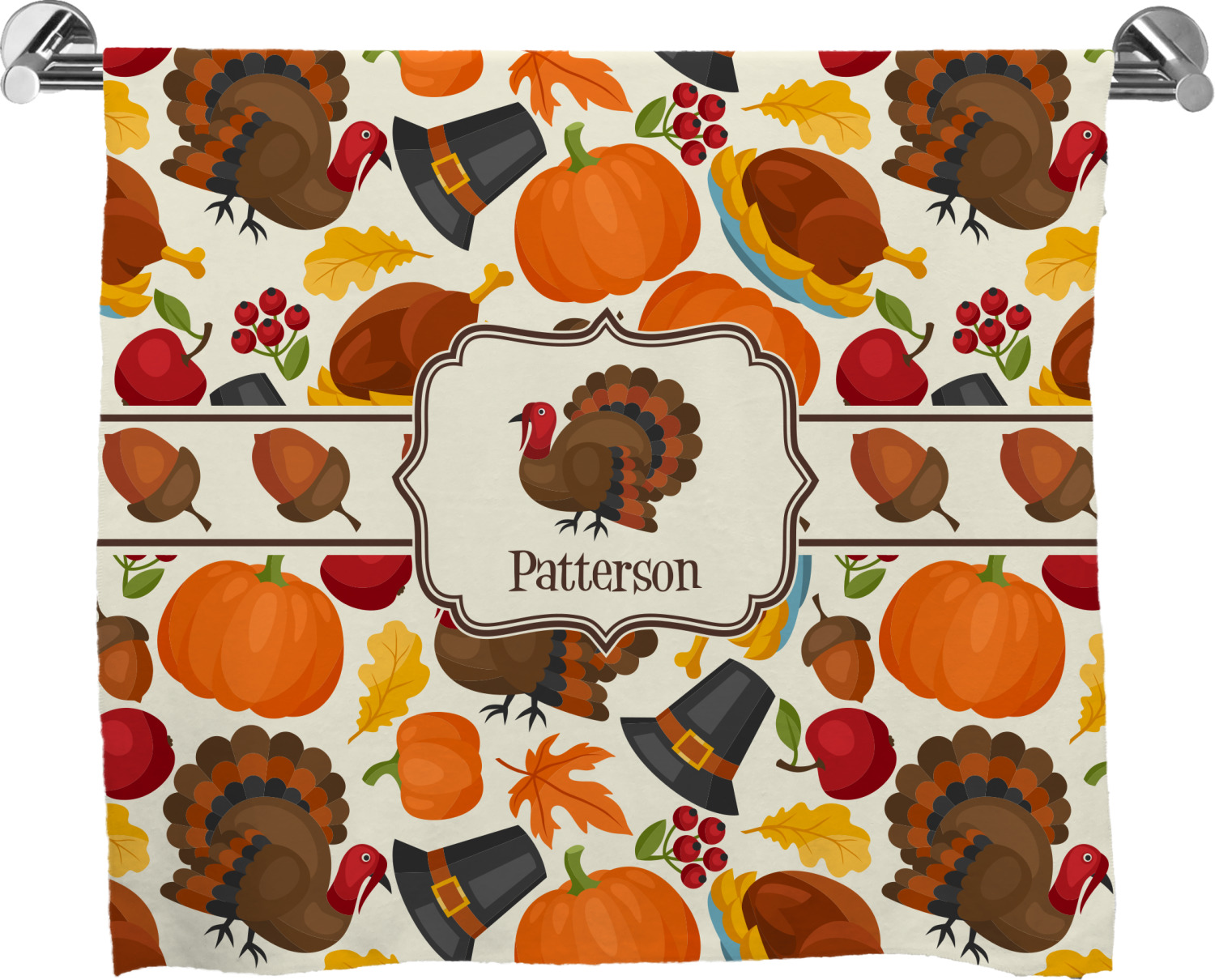 This traditional thanksgiving design is perfect for celebrating the season of giving thanks. This classic design includes turkey, pumpkin, pilgirm hat, berries, apples, acorns and leaves. The background on this design is re-color-able; and we chose the light yellow from the fall / thanksgiving color palette in our customization system.