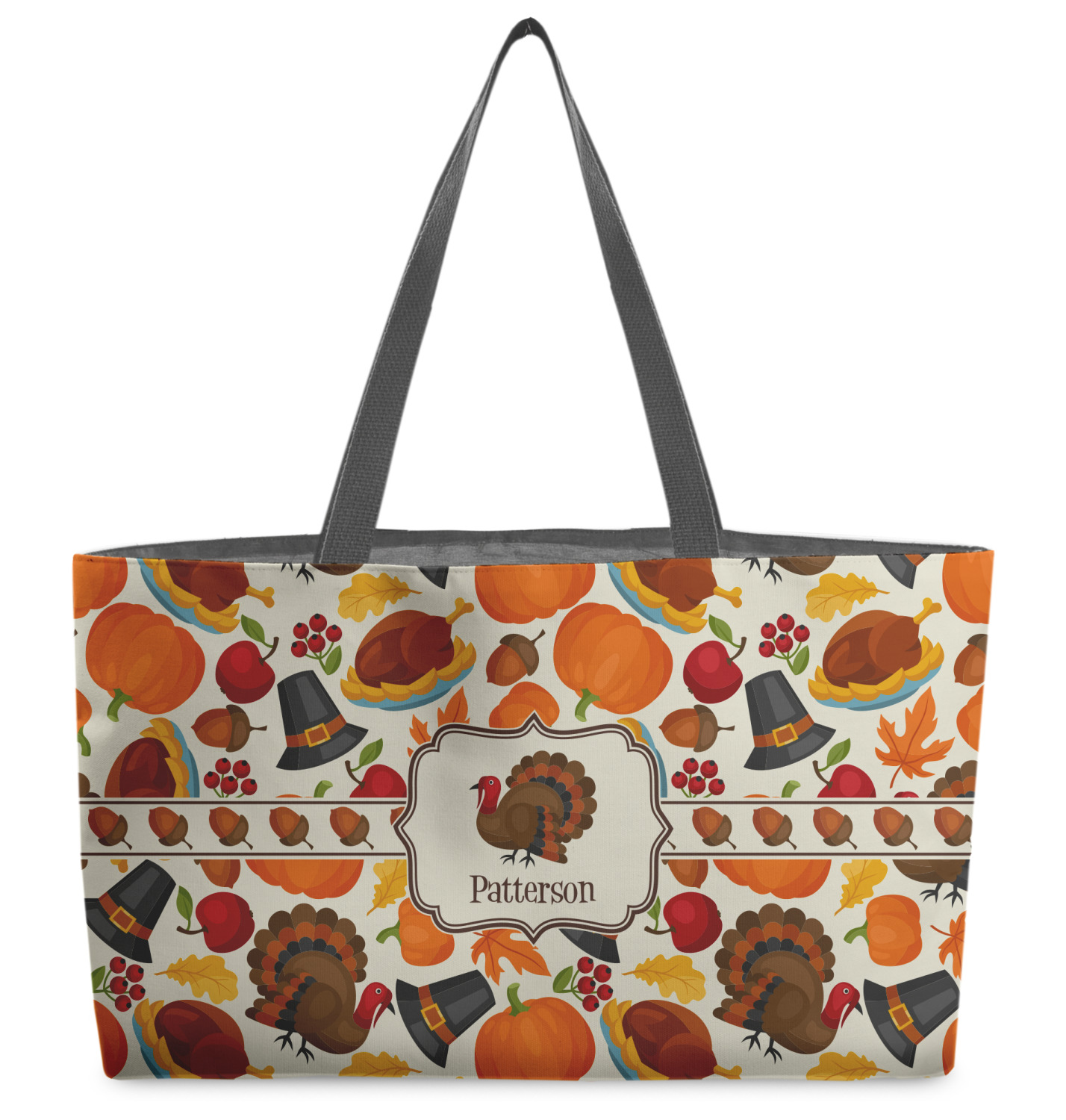 This traditional thanksgiving design is perfect for celebrating the season of giving thanks. This classic design includes turkey, pumpkin, pilgirm hat, berries, apples, acorns and leaves. The background on this design is re-color-able; and we chose the light yellow from the fall / thanksgiving color palette in our customization system.