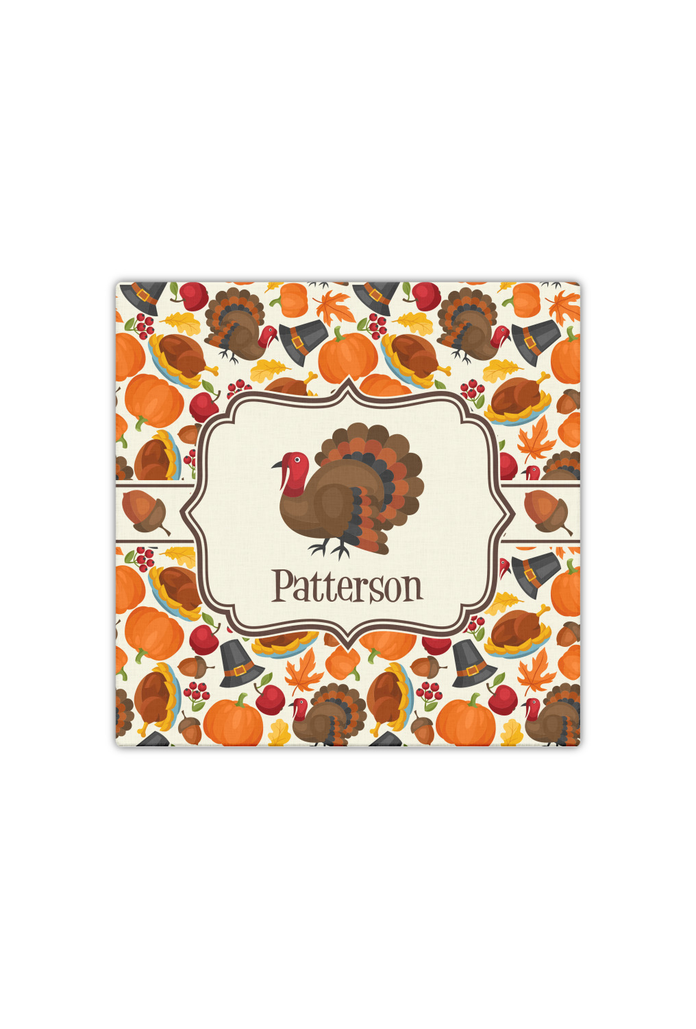 This traditional thanksgiving design is perfect for celebrating the season of giving thanks. This classic design includes turkey, pumpkin, pilgirm hat, berries, apples, acorns and leaves. The background on this design is re-color-able; and we chose the light yellow from the fall / thanksgiving color palette in our customization system.