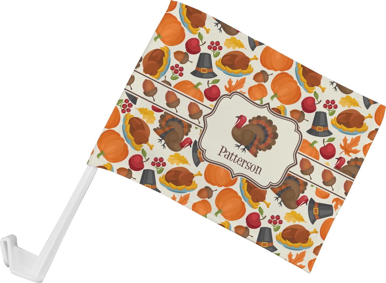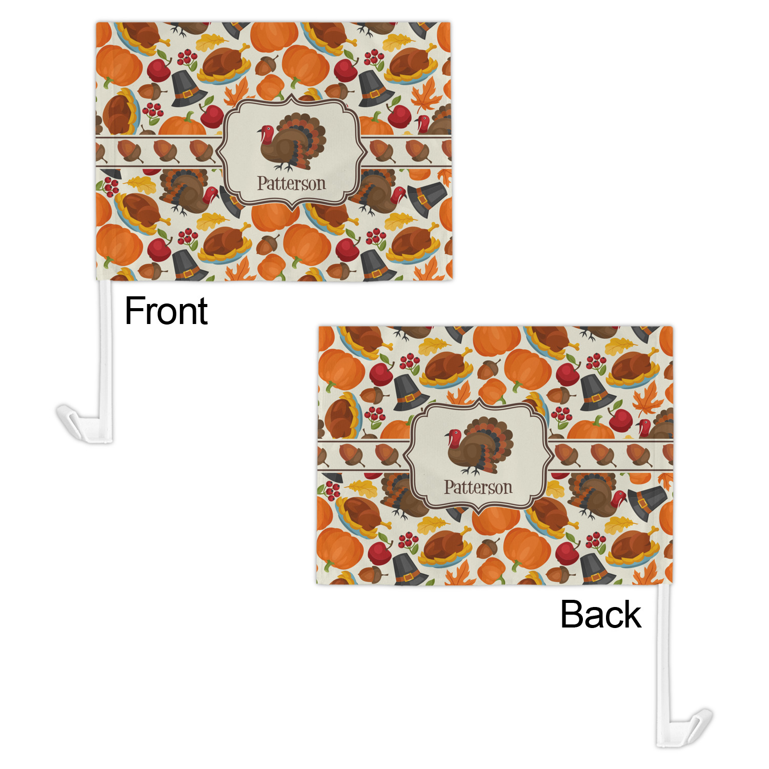 This traditional thanksgiving design is perfect for celebrating the season of giving thanks. This classic design includes turkey, pumpkin, pilgirm hat, berries, apples, acorns and leaves. The background on this design is re-color-able; and we chose the light yellow from the fall / thanksgiving color palette in our customization system.